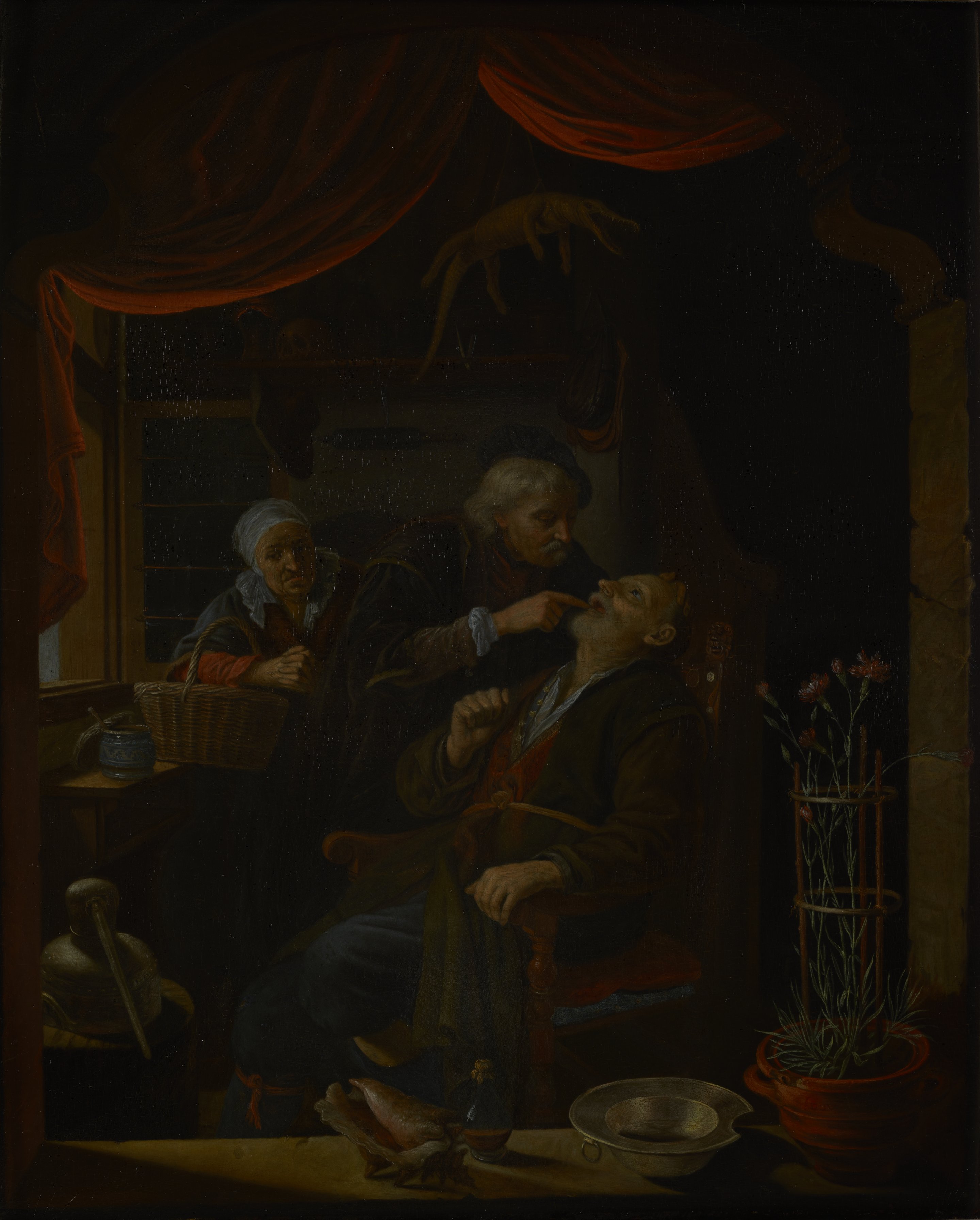 A foppishly-dressed dentist leans close to pull a tooth from a squirming patient while an older woman—perhaps the patient's wife—looks on from left. The painter has framed the scene with an illusionistic windowsill and curtain, as if the viewers peer inside the architecture—Dou's trademark compositional device. On the sill sits a potted plant, dented metal basin, and conch shell. An alembic at bottom left and a stuffed reptile specimen hanging from the ceiling allude to this dentist's diverse pursuits or guises. Painted on oak panel.