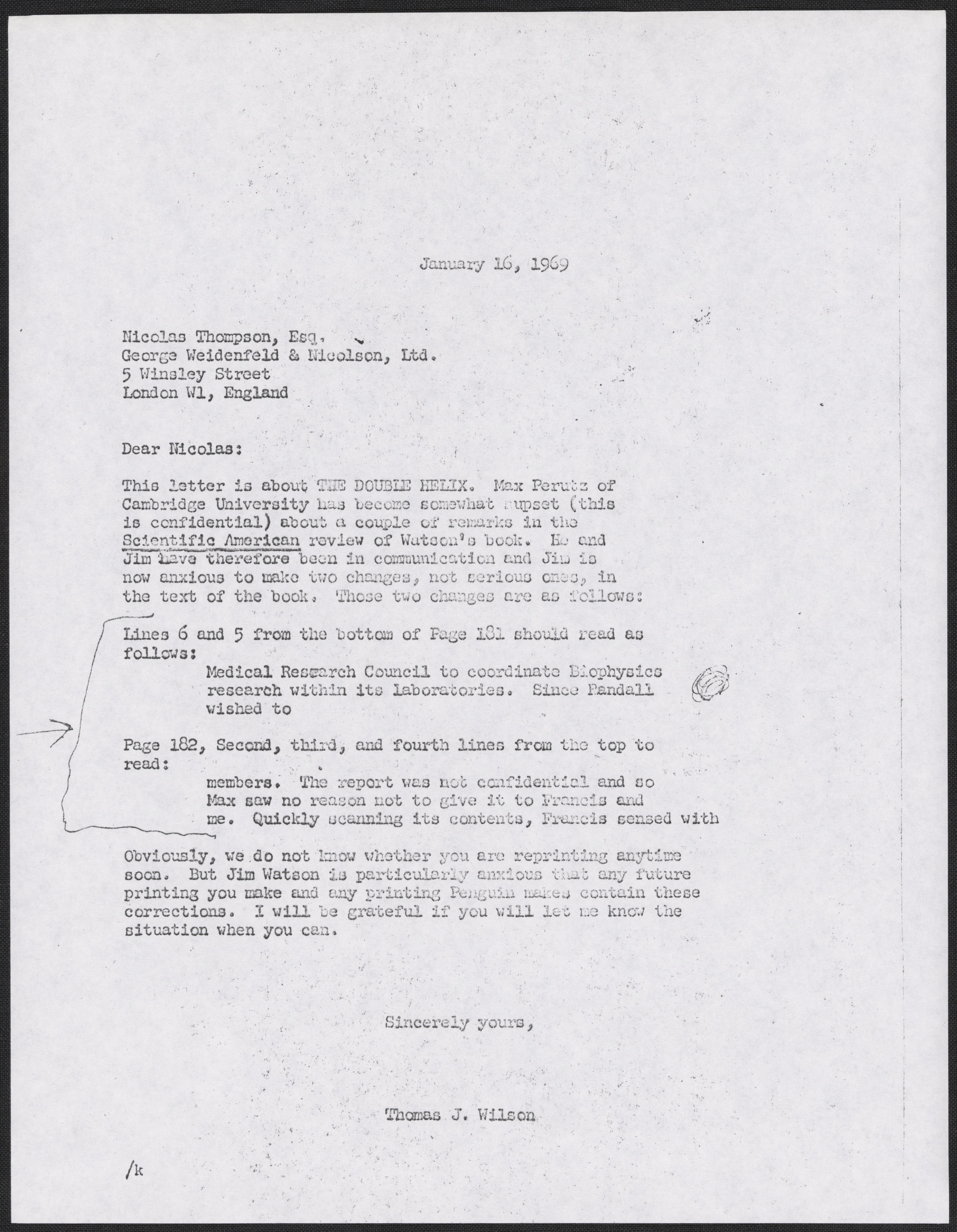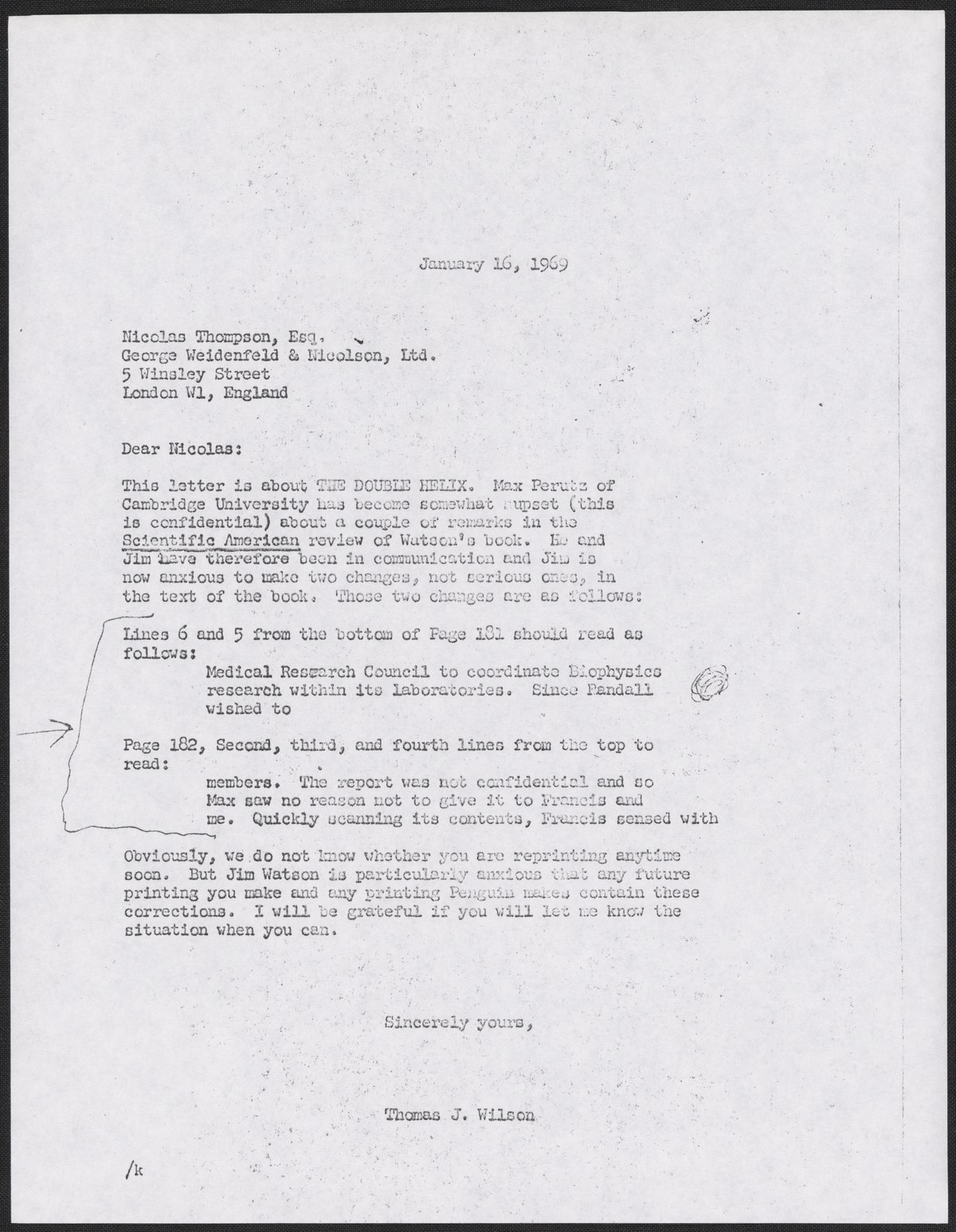 Letter from Thomas J. Wilson to Nicolas Thompson, January 16, 1969