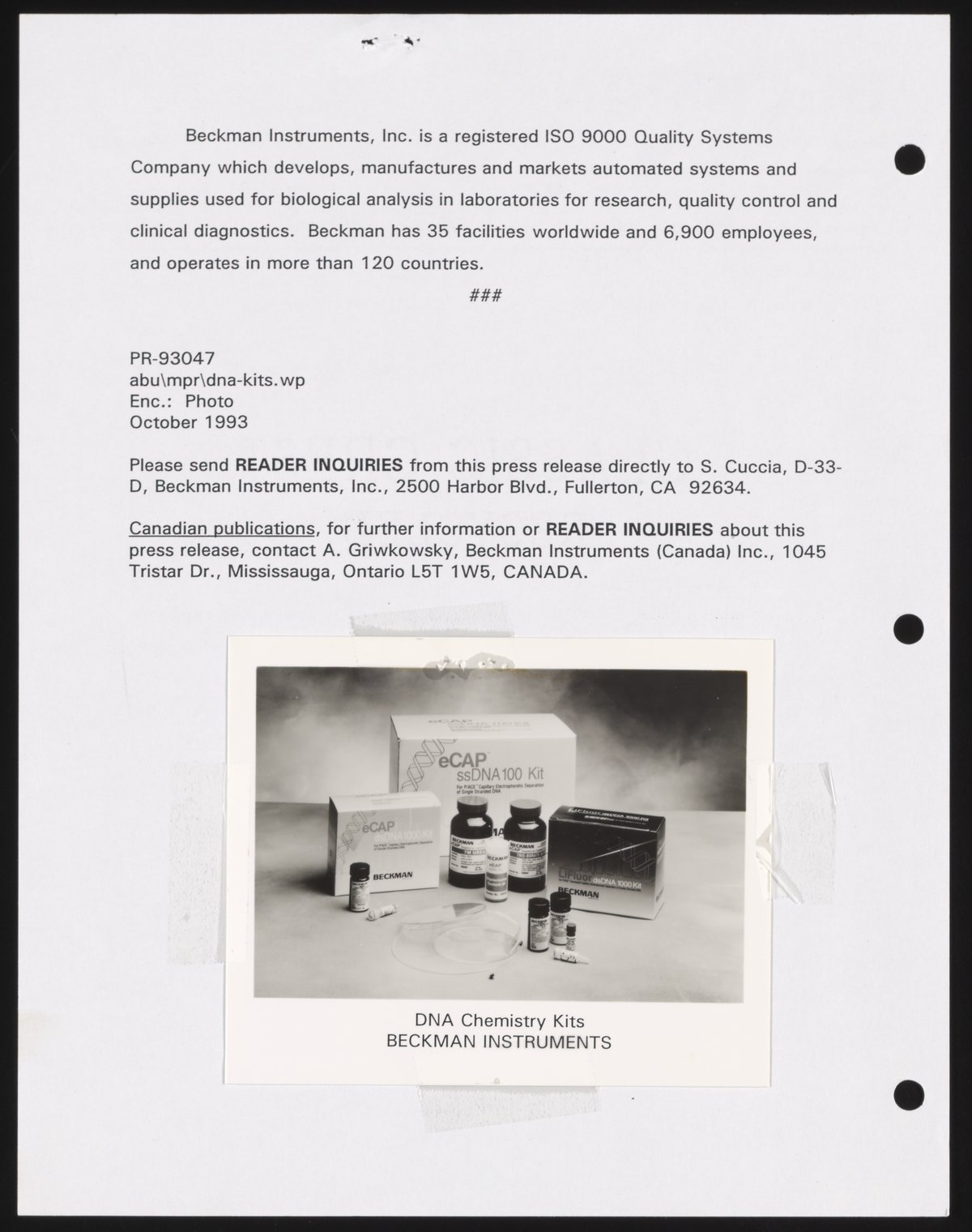 Eastman, Elke. “Beckman Introduced DNA Chemistry Kits for Capillary Electrophoresis,” October 1993. Beckman Historical Collection, Box 58, Folder 73. Science History Institute. Philadelphia. https://digital.sciencehistory.org/works/5712m6991.