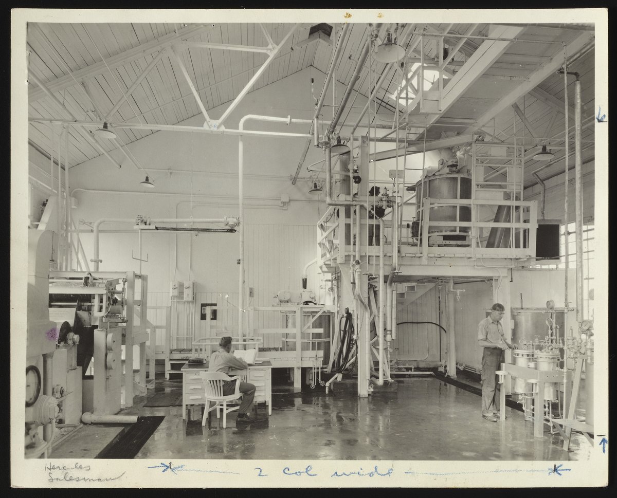 Hercules Incorporated. “Interior View of Hercules Hopewell Plant,” 1940–1949. Photographs from the Records & Ephemera of Hercules Incorporated, Box 1, Folder 35. Science History Institute. Philadelphia. https://digital.sciencehistory.org/works/5712m726q.
