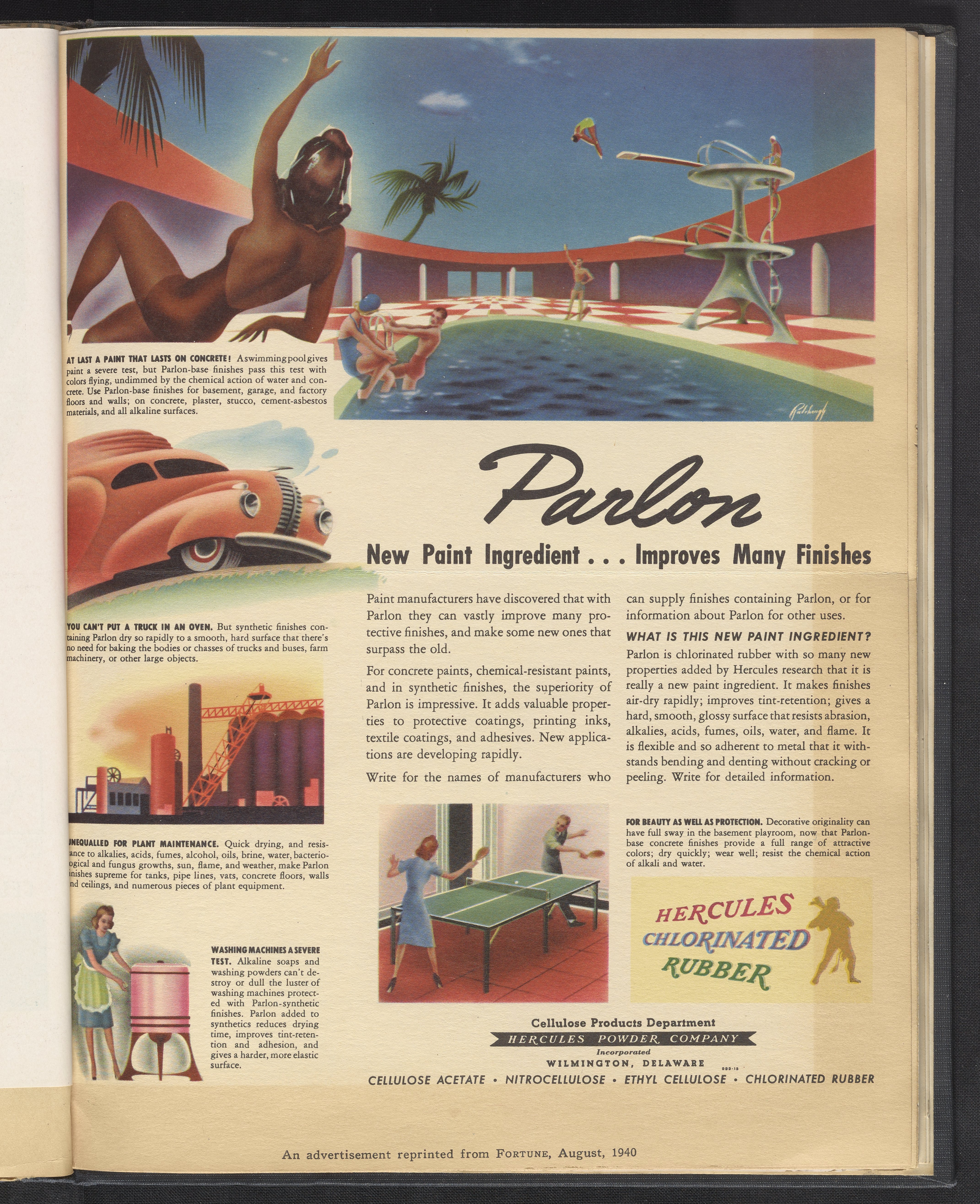 Hercules Incorporated. “Parlon: New Paint Ingredient...Improves Many Finishes.” 1940 Hercules Advertisements, 1940. Records of Hercules Incorporated, Volume 1940. Science History Institute. Philadelphia. https://digital.sciencehistory.org/works/5712m731k.