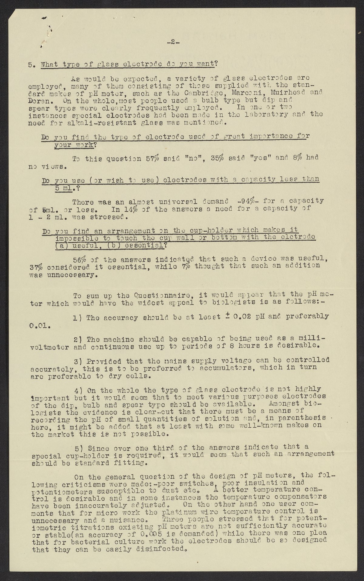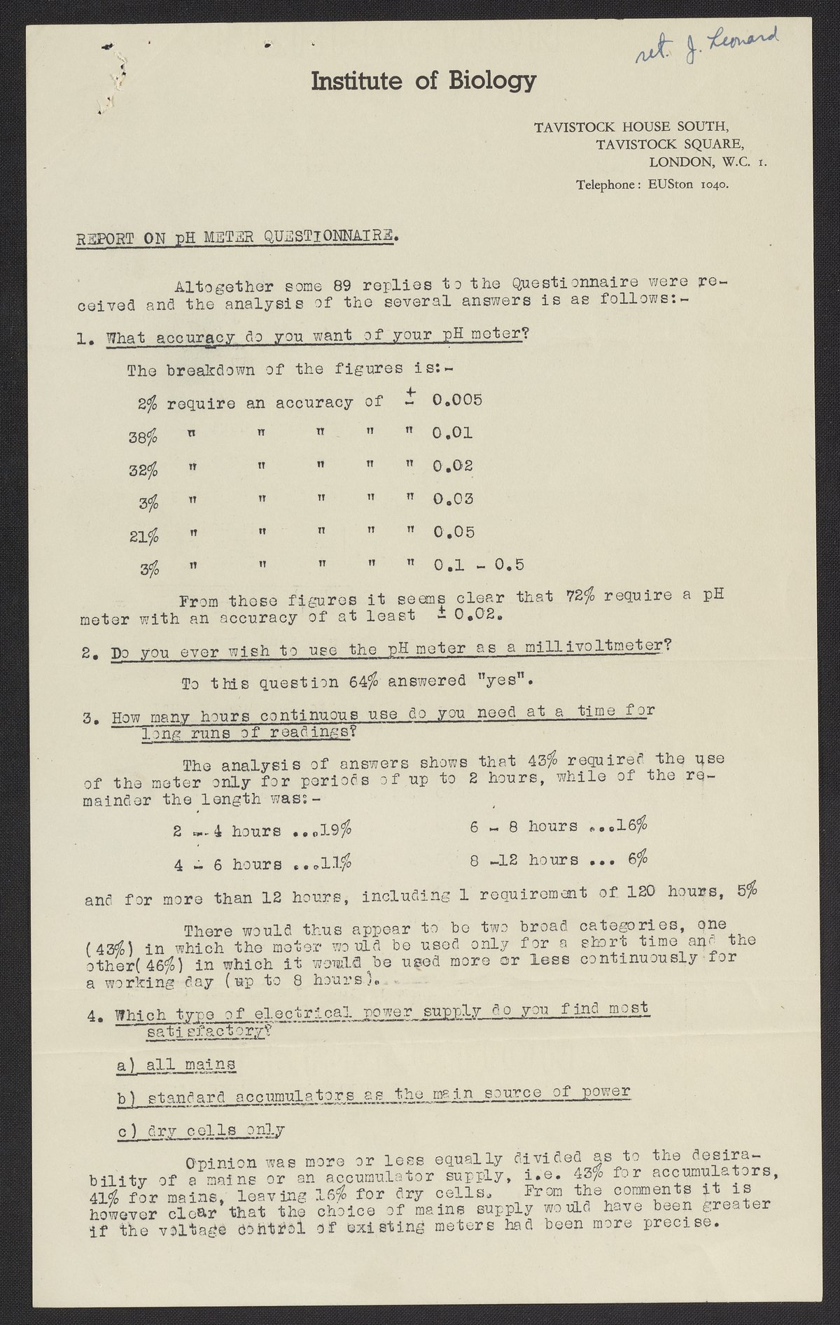 Institute of Biology. “Institute of Biology Report on PH Meter Questionnaire,” 1955. Beckman Historical Collection, Box 19, Folder 15. Science History Institute. Philadelphia. https://digital.sciencehistory.org/works/5712m734d.