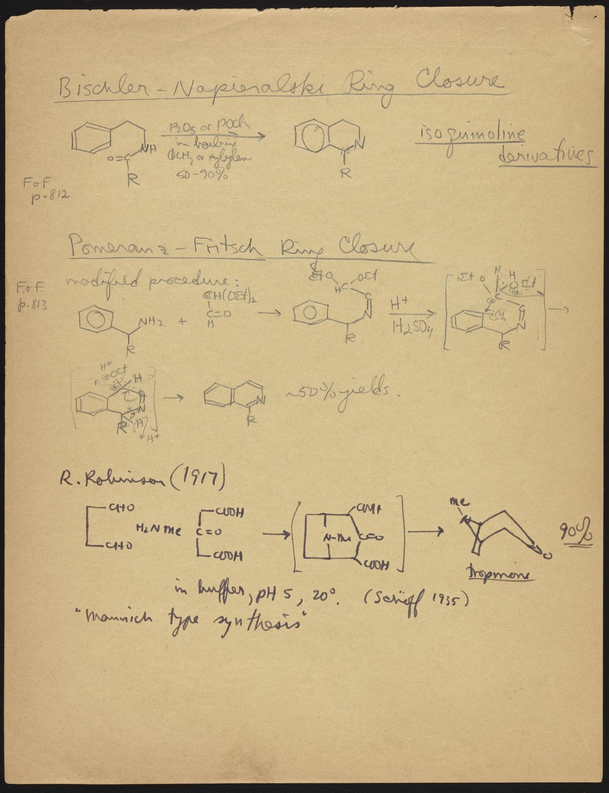 Kohler, Robert E. “R. B. (Robert Burns) Woodward Seminar Entitled ‘The Fundamental Condensation.’” Notes from R. B. (Robert Burns) Woodward's Seminars, circa 1959–1966. Folder 2. Science History Institute. Philadelphia. https://digital.sciencehistory.org/works/5712m745x.