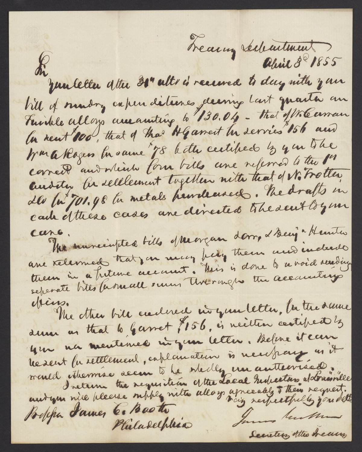 Small JPG1200 x 1495px — 327 KBLarge JPG2880 x 3587px — 1.4 MBFull-sized JPG3335 x 4154px — 1.8 MBOriginal fileTIFF — 3335 x 4154px — 39.7 MBJames B. Guthrie (1792 - 1869), United States Secretary of the Treasury from 1853-1857, writes to James Curtis Booth (1810-1888) concerning finances and requisitions.
