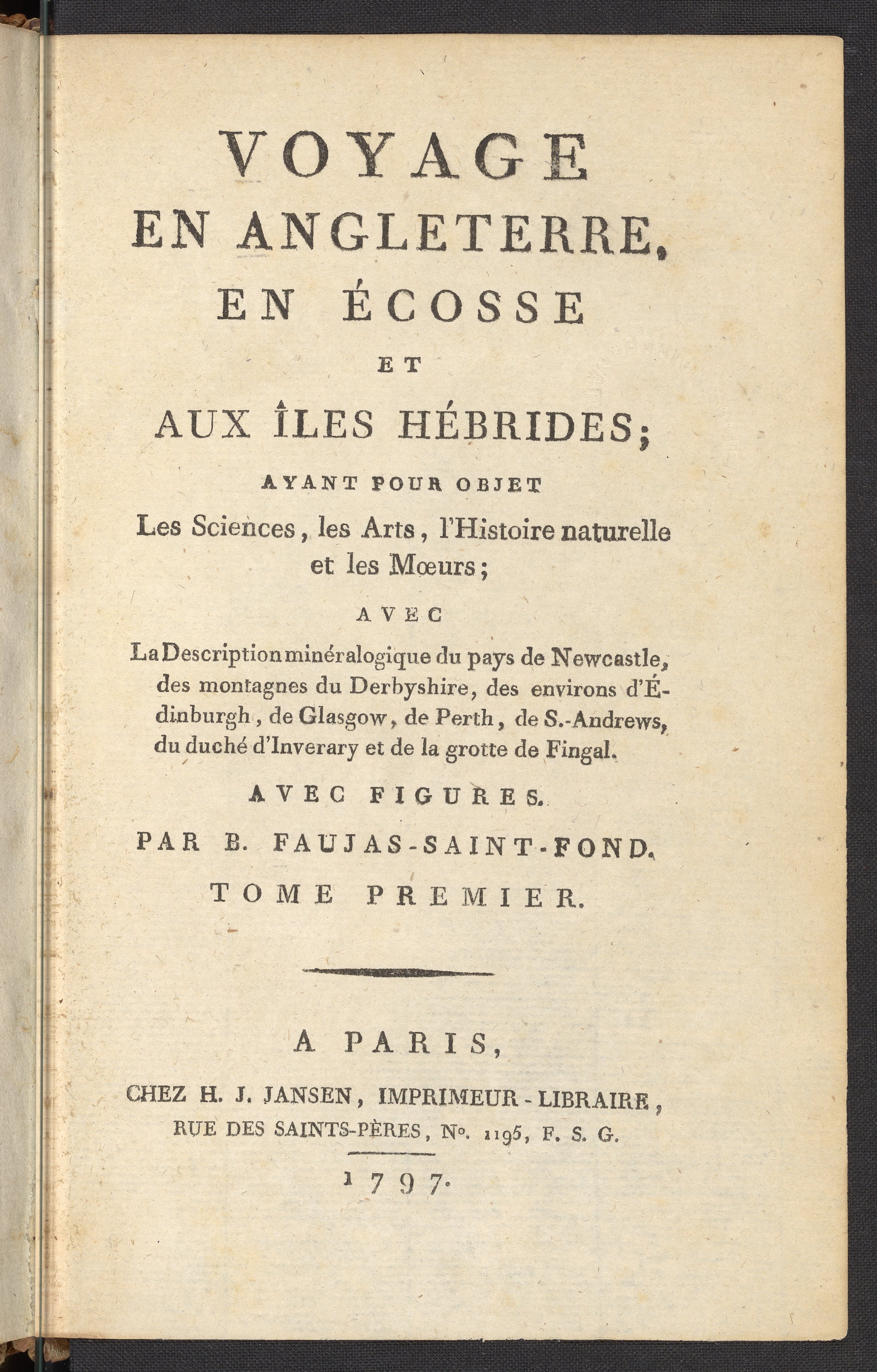 Small JPG1200 x 1878px — 431 KBLarge JPG2880 x 4507px — 2.4 MBFull-sized JPG3108 x 4864px — 2.7 MBOriginal fileTIFF — 3108 x 4864px — 26.2 MBThis book is volume 1 of 2 books written by French geologist Faujas-de-St.-Fond (1741-1819). In 1784 he traveled throughout England, Scotland, and the Hebrides. While the original publication is written in French, de-St.-Fond did speak and understand English. A valuable skill during his travels, as he did not need the aid of a translator, which led to easy conversations with locals. Early naturalists considered these conversations vital to their research, as the local people were considered part of the environment. Locals lived in a sort of symbiosis with their environment, with their culture affecting the environment and their environment affecting their culture. These volumes contain important information on the application of sciences to English industries, as well as the geology of the British Isles. The most notable of the descriptions on the British Isles is that of the geology of the Western Isles of Scotland, which include a plate of Fingal's Cave at the Isle of Staffa.