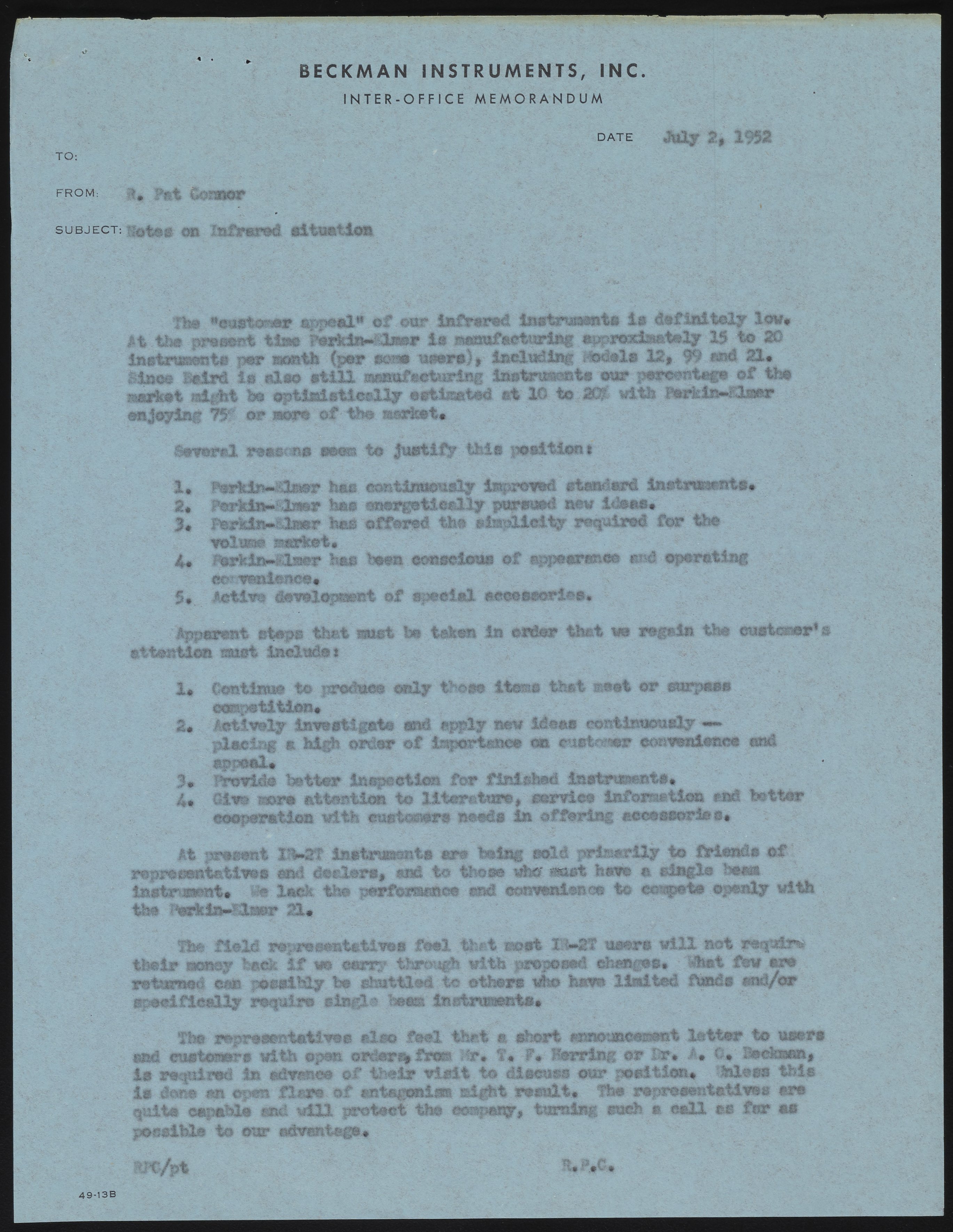 This internal memo documents concerns about Beckman Instruments' reputation in the infrared spectroscopy field. These concerns are due to fierce competition from Perkin-Elmer and problems with the Beckman IR-2T. At the time of this memo, Beckman Instruments staff were quickly working to address multiple issues with the IR-2T, which became apparent only after the instrument was on the market.