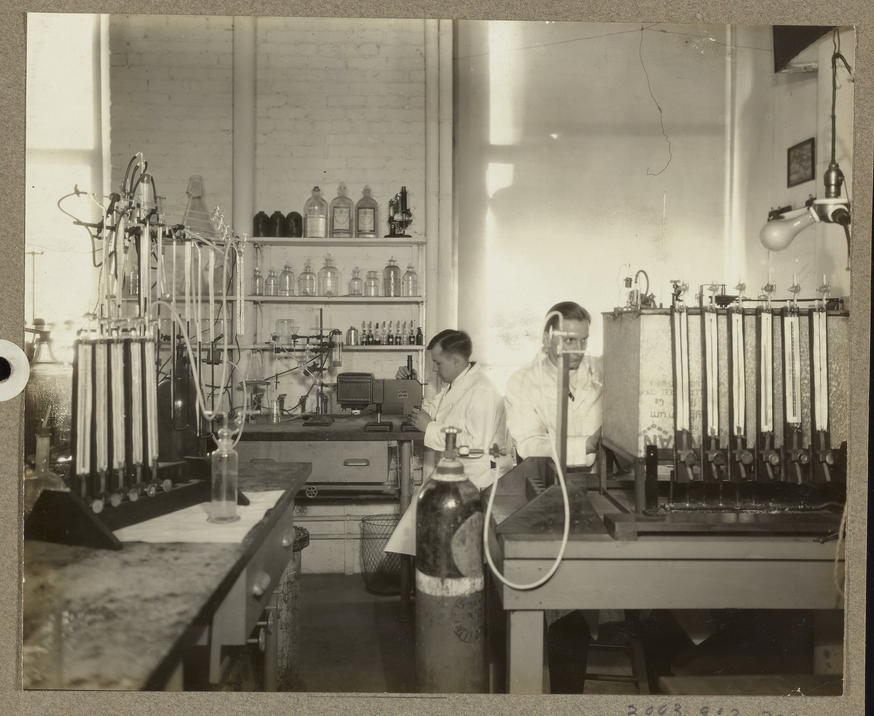 “Dr. Burk and Mr. Lineweaver with Microapparatus for Studying Bacterial Nitrogen Fixation,” January 8, 1930. Travis P. Hignett Collection of Fixed Nitrogen Research Laboratory Photographs, Box 2. Science History Institute. Philadelphia. https://digital.sciencehistory.org/works/5999n347r.