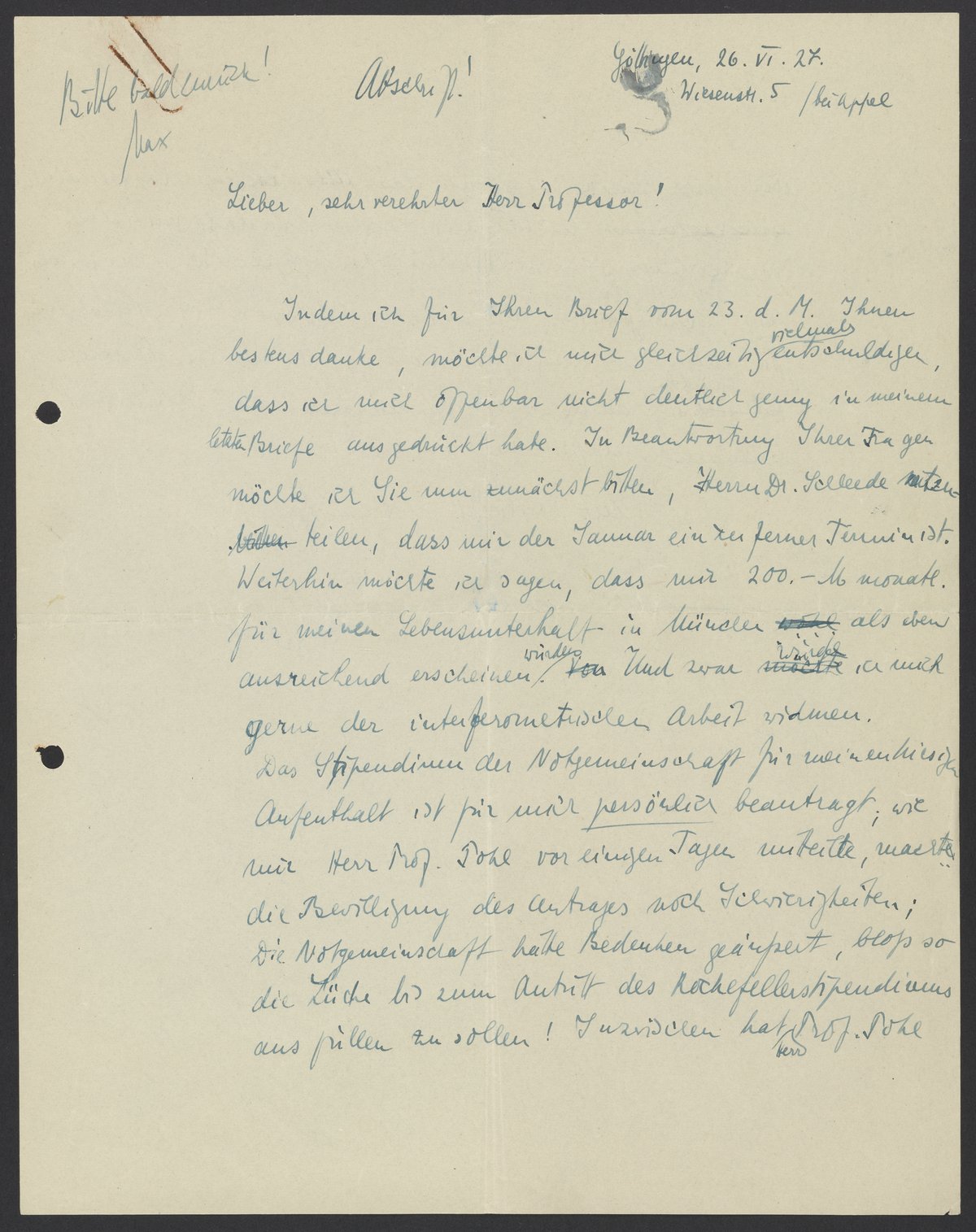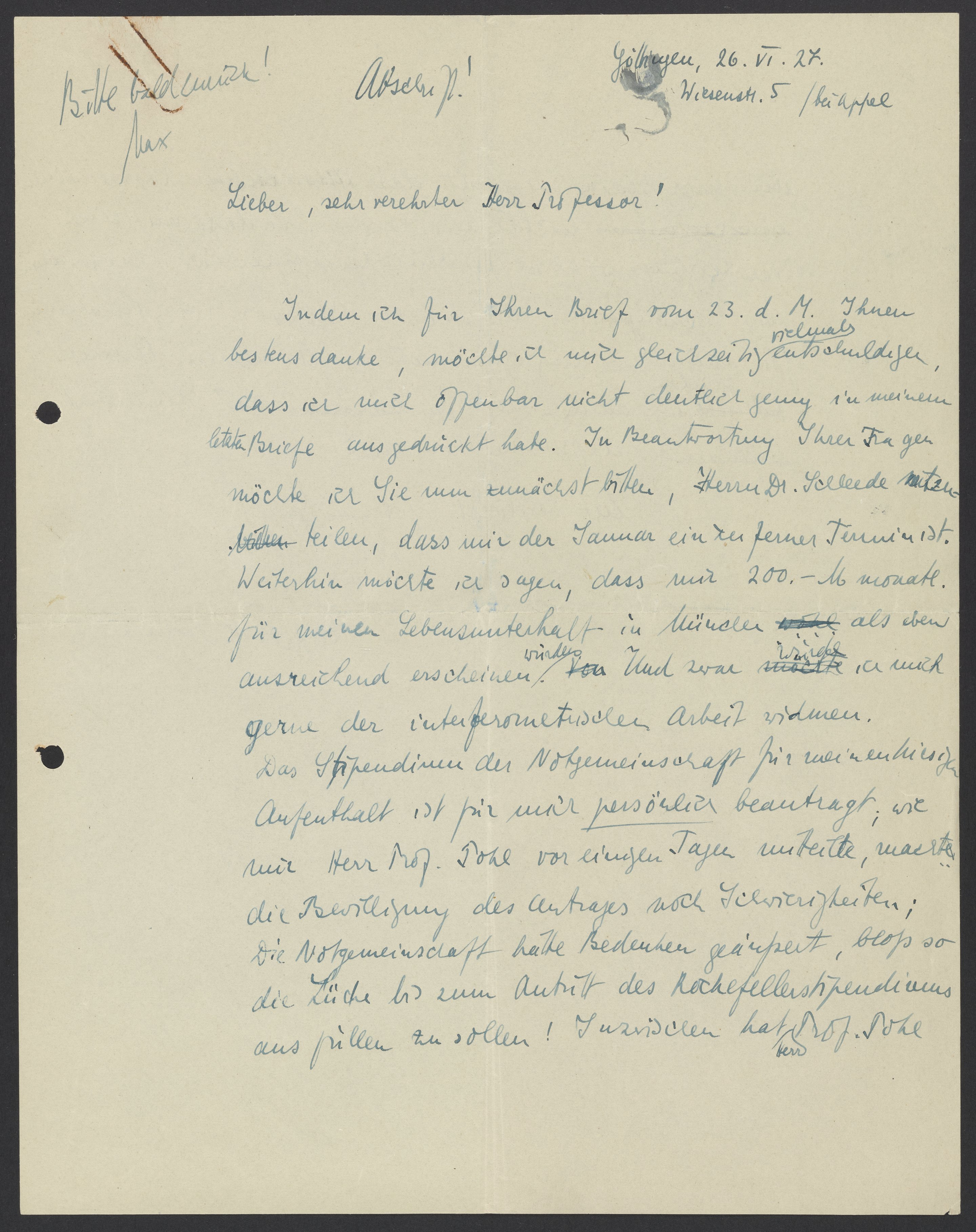 Indem ich für Ihren Brief vom 23 d.M. Ihnen bestens danke, möchte ich mich gleichzeitig vielmals entschuldigen, dass ich mich offenbar nicht deutlich genug in meinem letzten Brief ausgedrückt habe. In Beantwortung Ihrer Fragen möchte ich Sie nun zunächst bitten, Herrn Dr. Schleede mitzuteilen, dass mir der Januar ein ferner Termin ist. Weiterhin möchte ich sagen, dass mir 200.- M Monate für meinen Lebensunterhalte in Munch eben ausreichend erscheinen würden. Und zwar würde ich mich gerne der interferometrischen Arbeit widmen.