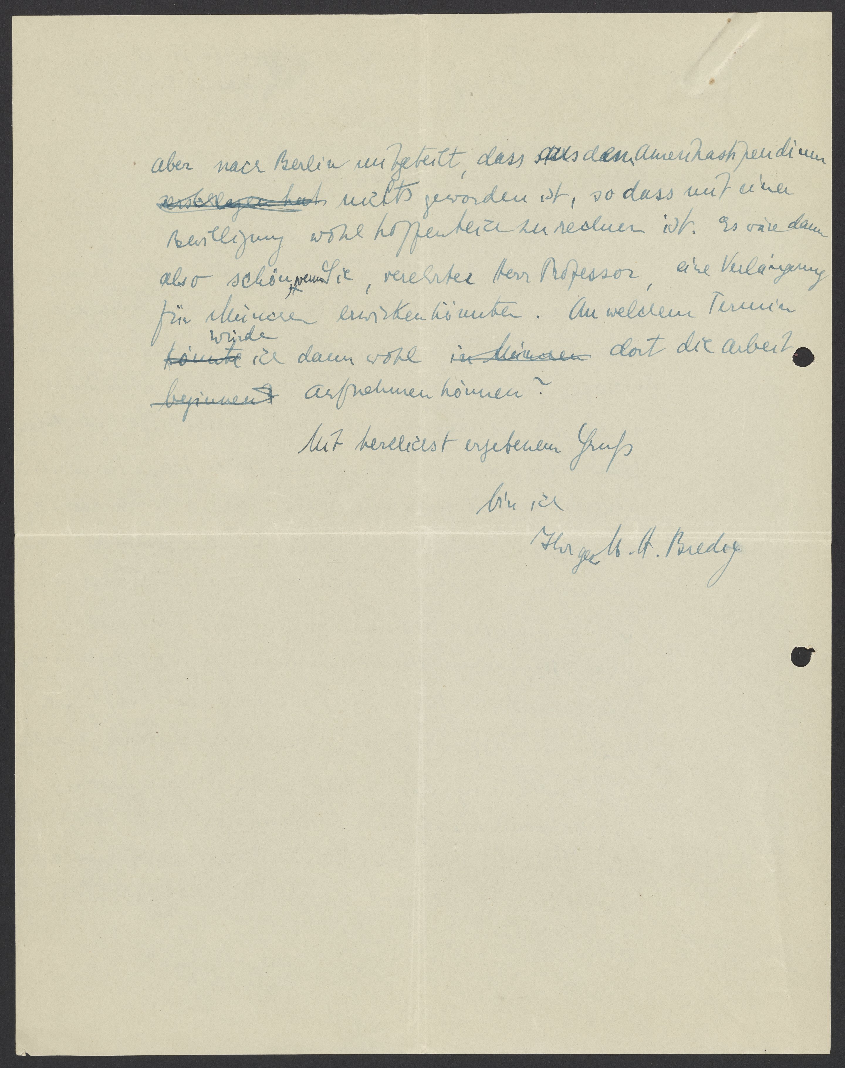 aber nach Berlin mitgeteilt, dass das Austauschstipendium nichts geworden ist, so dass mit einer Bewilligung wohl hoffentlich zureden ist. Es wäre denn also schön, wenn Sie, verehrter Herr Professor, eine Verlängerung für München einwirken könnten. An welchem Termin würde ich dann wohl dort die Arbeit aufnehmen können?
