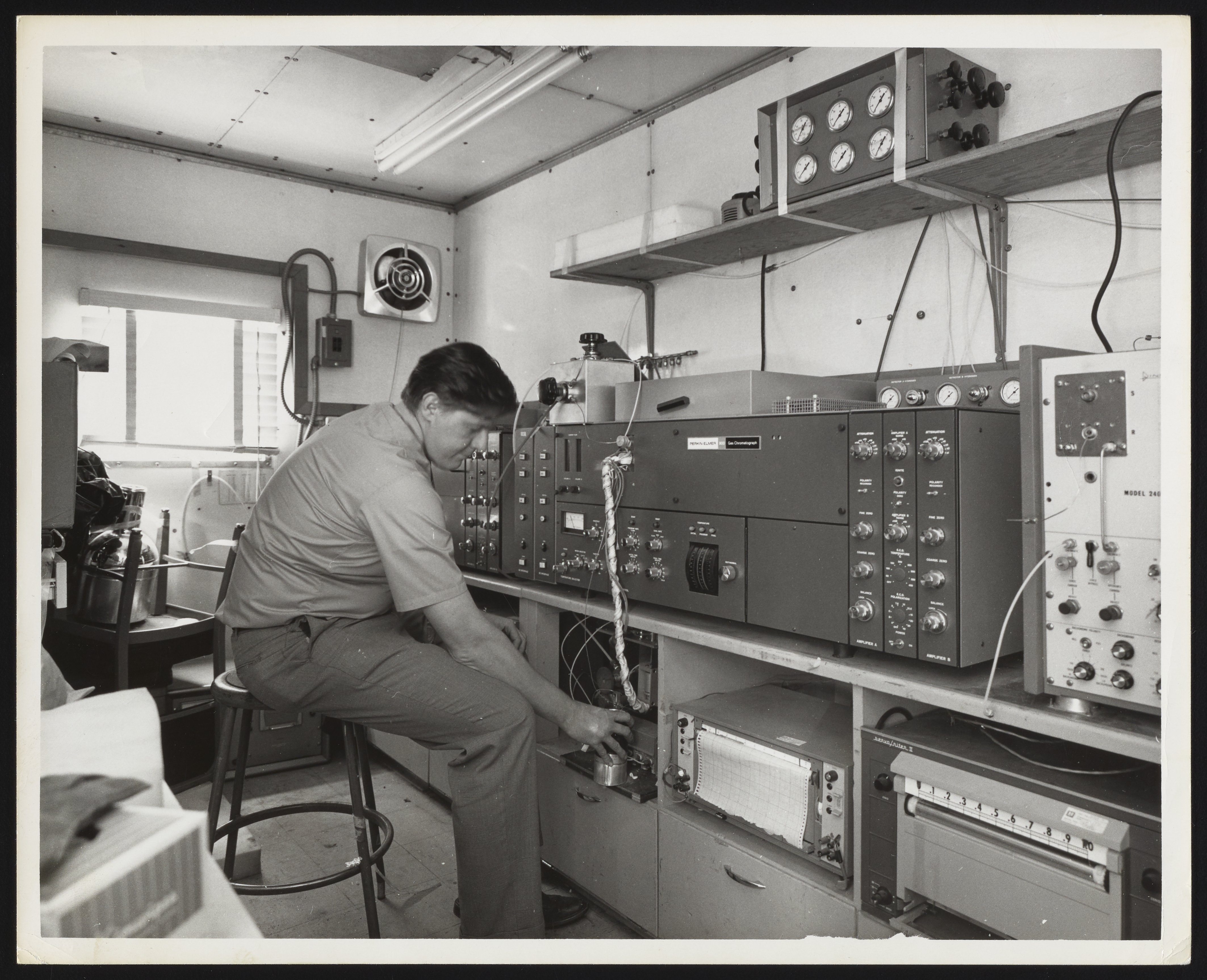 General view of chemist William A. Lonneman preparing an air sample for analysis by three Perkin-Elmer gas chromatographs in an Environmental Protection Agency (EPA) mobile laboratory. Per notations accompanying the photograph, the gas chromatographs were used to conduct compositional analyses of air samples from across the country in an effort to pinpoint polluters and study the parameters for the development of environmentally damaging pollutants, including hydrocarbons, oxides of nitrogen and sulfur, and other producers of photochemical "smog."