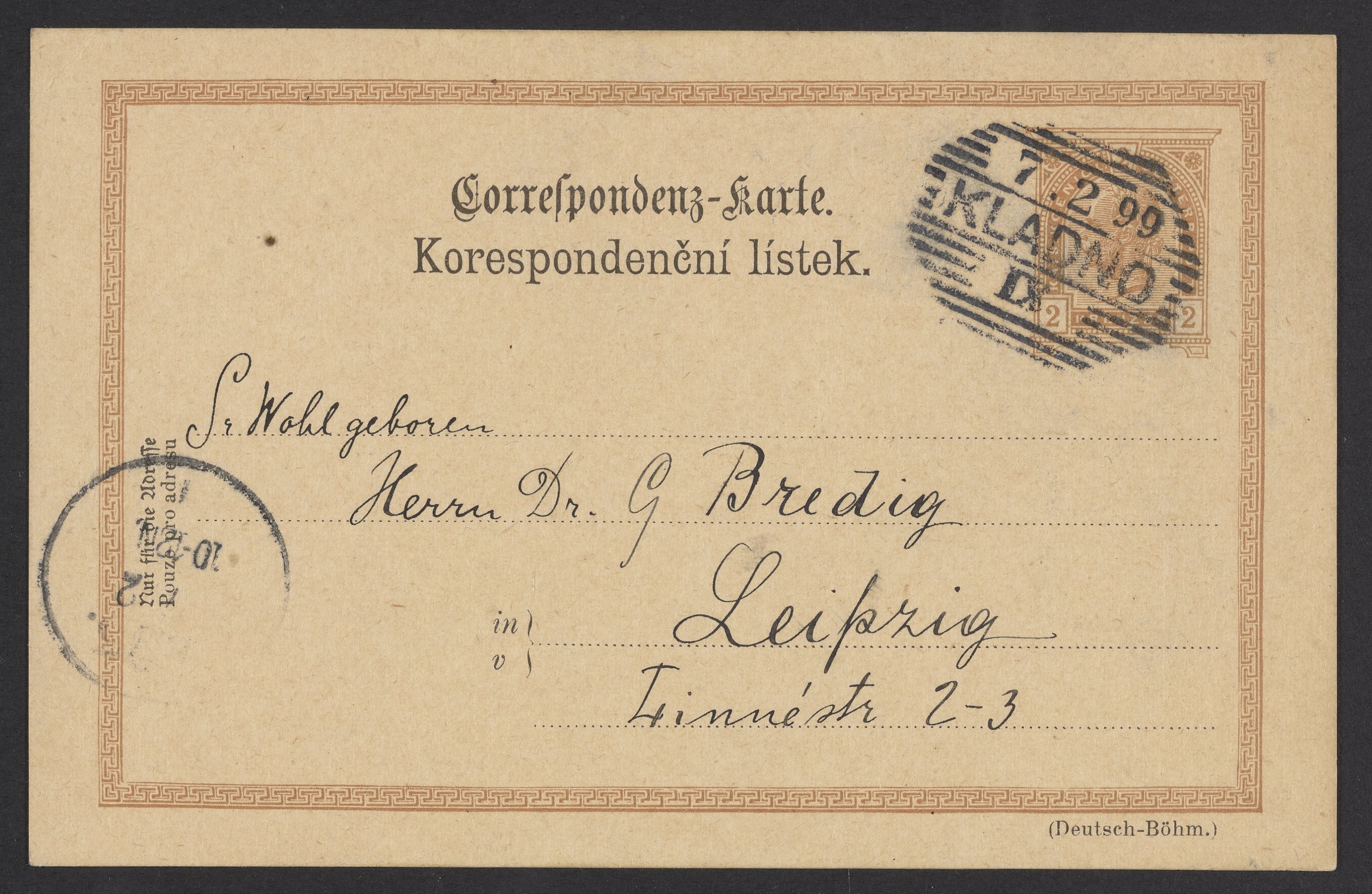 Small JPG1200 x 783px — 183 KBLarge JPG2880 x 1878px — 981 KBFull-sized JPG3567 x 2326px — 1.4 MBOriginal fileTIFF — 3567 x 2326px — 23.8 MBPostcard from Frantisek Wald (1861-1930) to Georg Bredig (1868-1944), mentioning publications in the Journal Physical Chemistry. Wald was the chief chemist of the Prazska Zelezarska Spolecnost Ironworks in Kladno, Czech Republic from 1886-1908. In 1908, he began a professorship at the Czech Technical University.