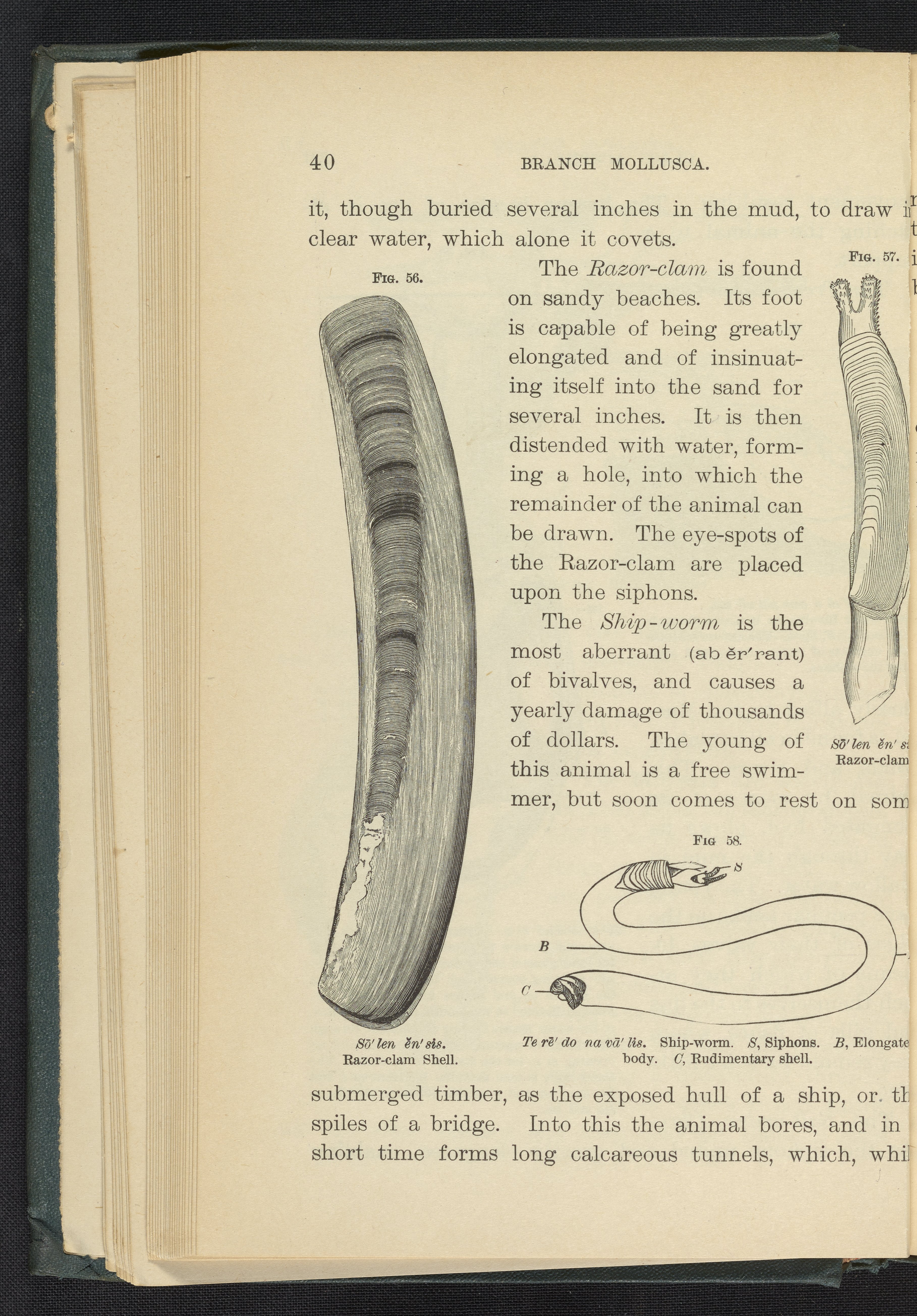 Steele, Joel Dorman, and Jenks, J. W. P. (John Whipple Potter). “Figure 56. Razor-Clam Shell. Figure 57. Razor-Clam. Figure 58. Ship-Worm .” Popular Zoology. New York, New York: Chautauqua Press, 1887. https://digital.sciencehistory.org/works/5gmovnd.