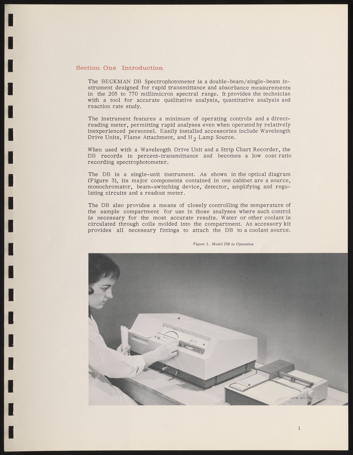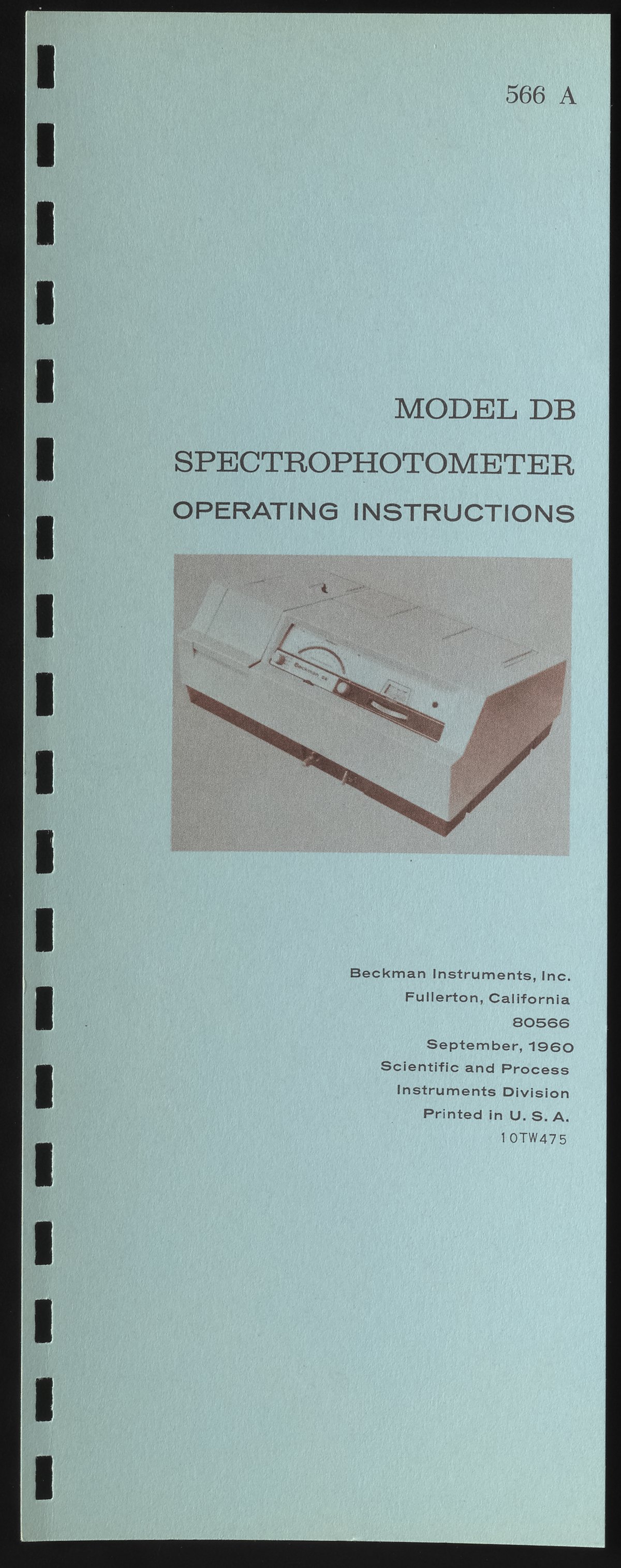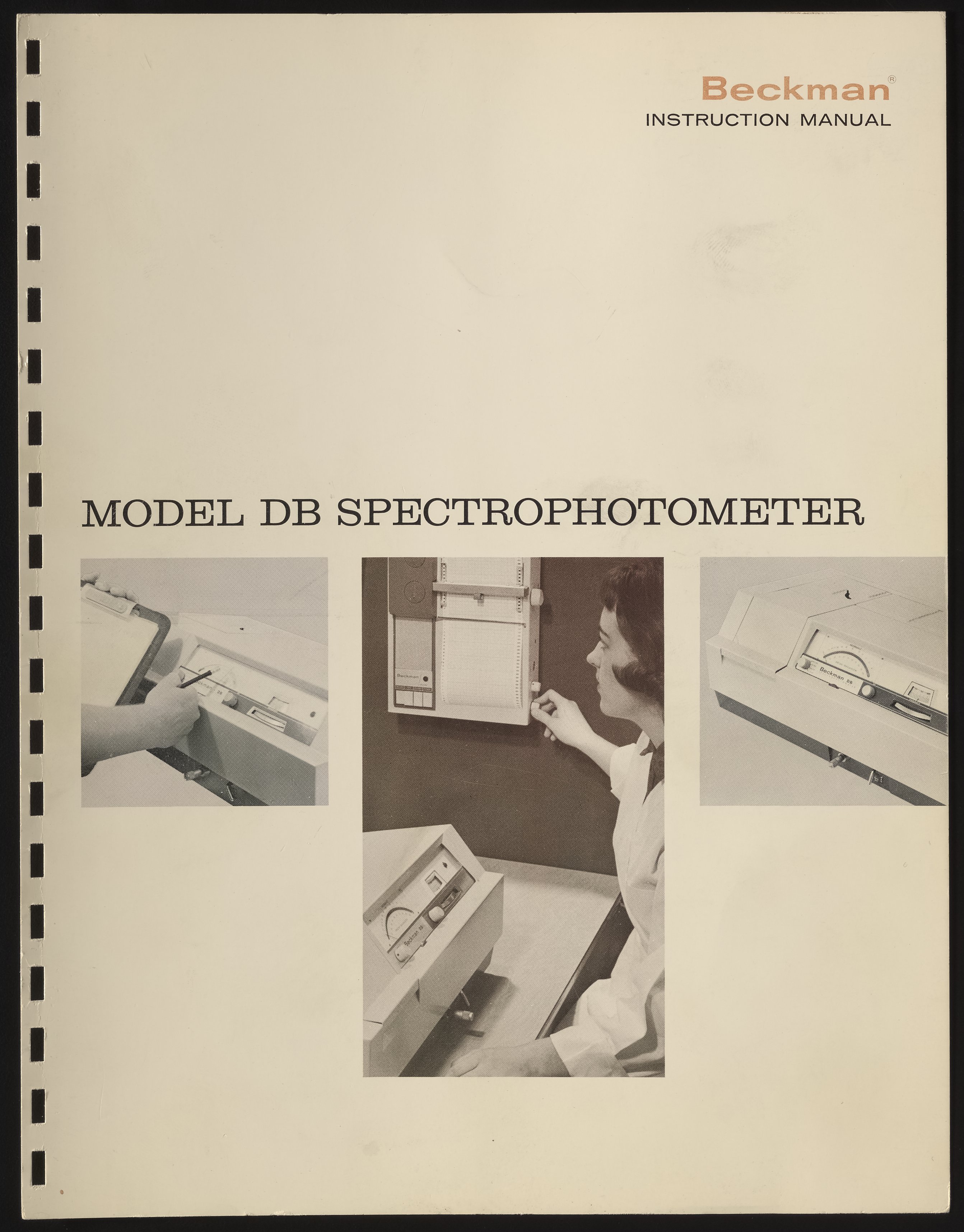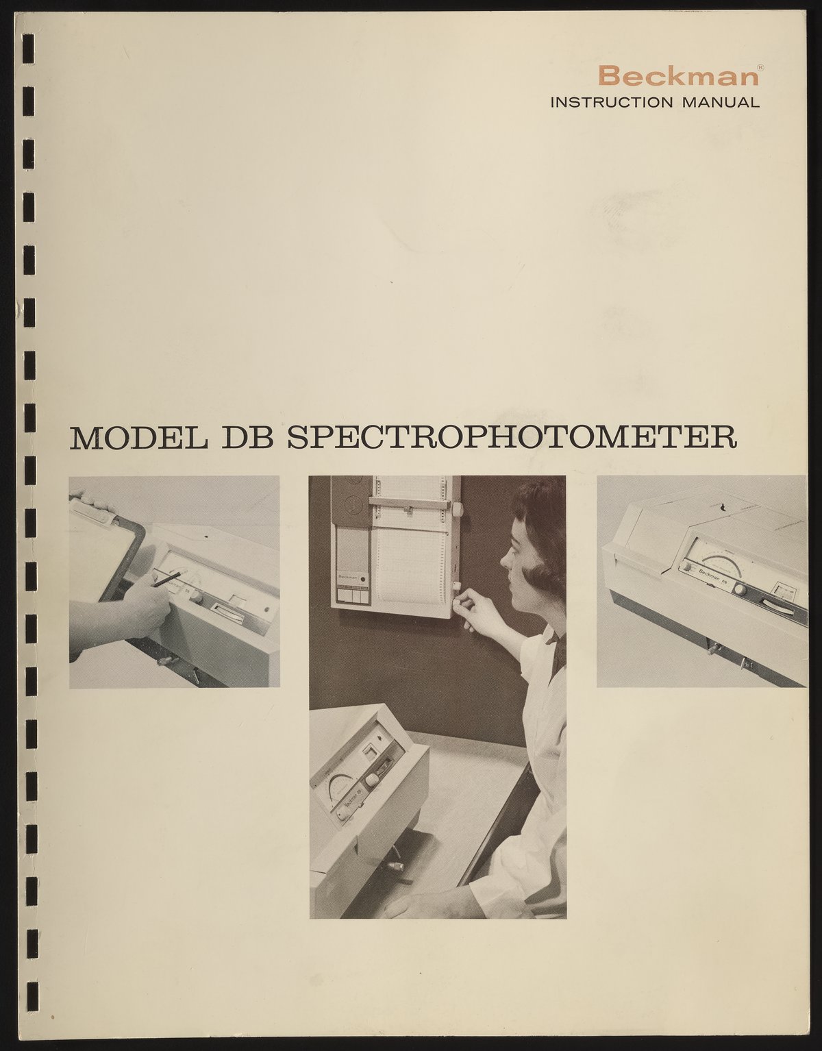 Beckman Instruments, Inc. “Beckman Model DB Spectrophotometer Instruction Manual,” 1960. Beckman Historical Collection, Box 106, Folder 2. Science History Institute. Philadelphia. https://digital.sciencehistory.org/works/5h73pw14h.