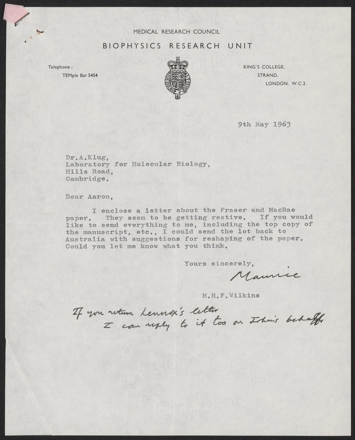 Letter from Aaron Klug to Maurice Wilkins, May 10, 1963