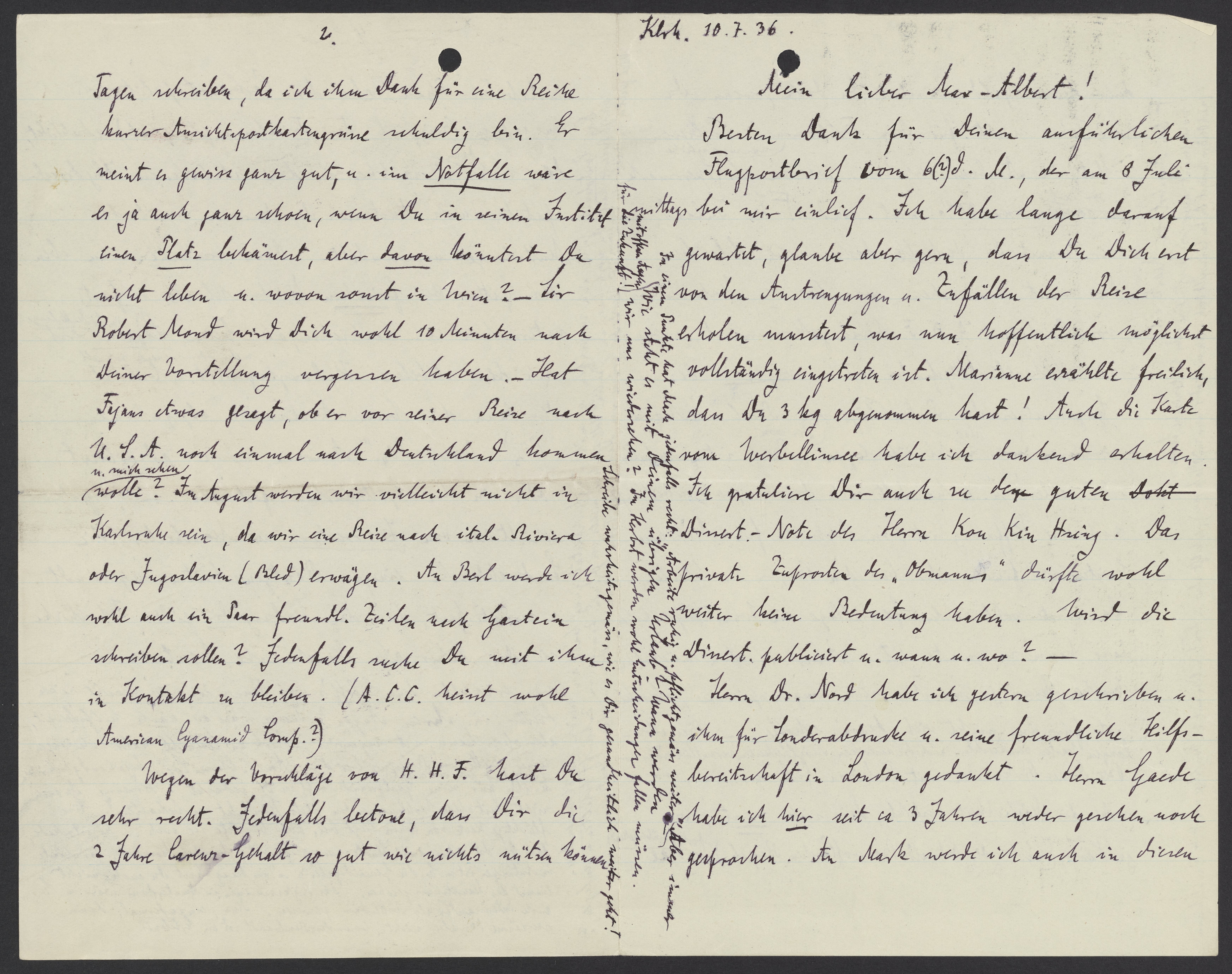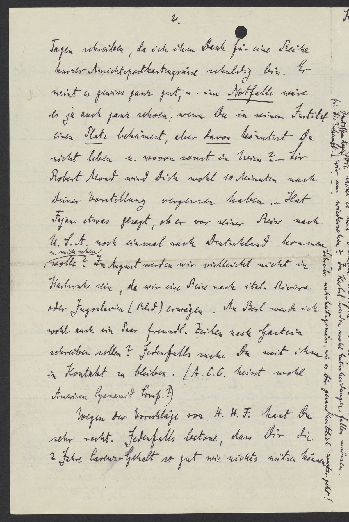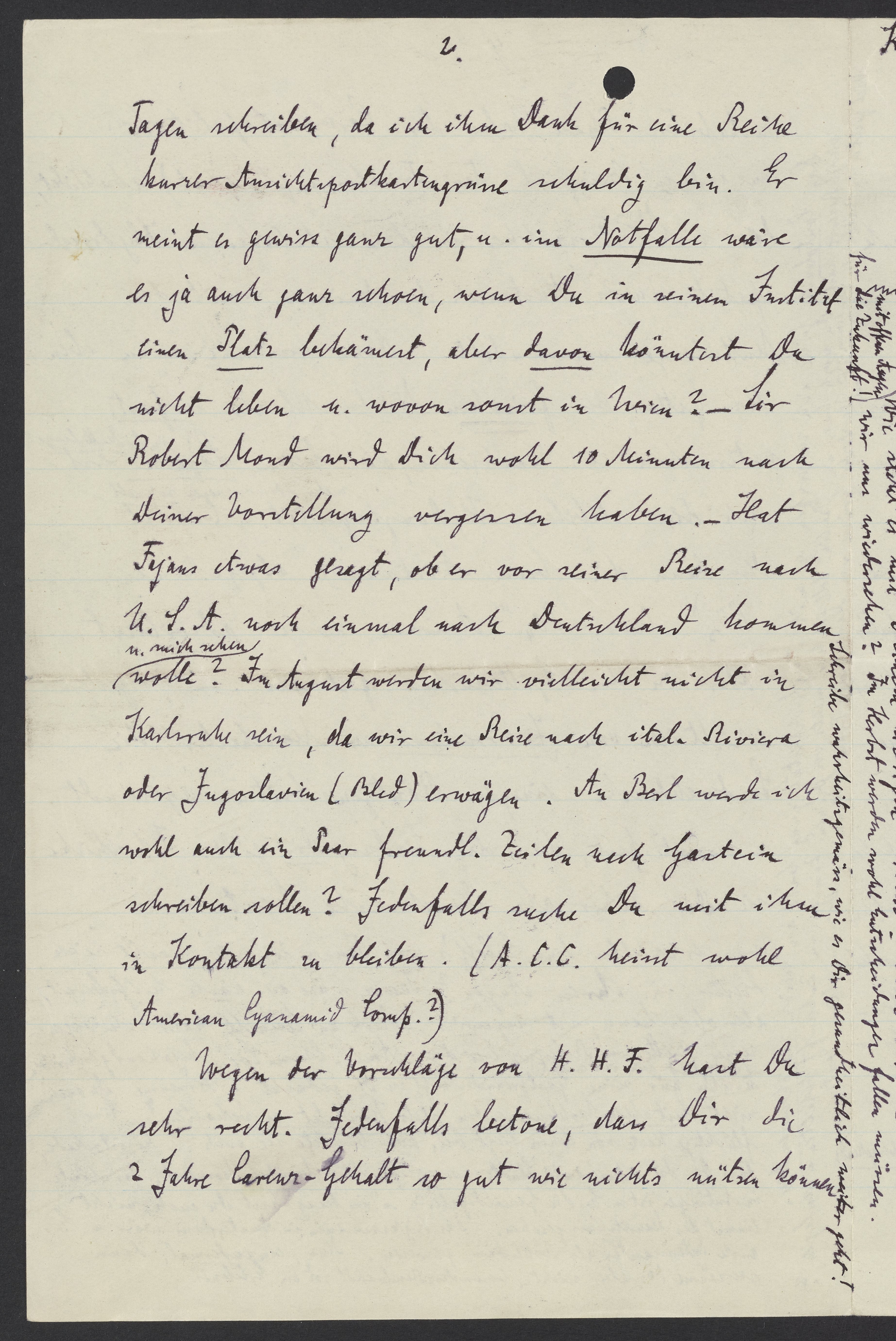 Tagen schreiben, da ich ihm Dank für eine Reihe kurzer Ansichtspostkartengrüsse schuldig bin. Er meint es gewiss ganz gut, u. im Notfalle wäre es ja auch ganz schön, wenn Du in seinem Institut einen Platz bekämest, aber davon könntest Du nicht leben u. wovon sonst in Wien? – Sir Robert Mond wird Dich wohl 10 Minuten nach Deiner Vorstellung vergessen haben. – Hat Fajans etwas gesagt, ob er vor seiner Reise nach U.S.A noch einmal nach Deutschland kommen u. mich sehen wolle? Im August werden wir vielleicht nicht in Karlsruhe sein, da wir eine Reise nach ital. Riviera oder Jugoslawien (Bled) erwägen. An Berl werde ich wohl auch ein Paar freundl. Zeilen nach Gasten schreiben sollen? Jedenfalls suche Du mit ihm in Kontakt zu bleiben. (A.C.C. heisst wohl American Cyanamid Comp.?)