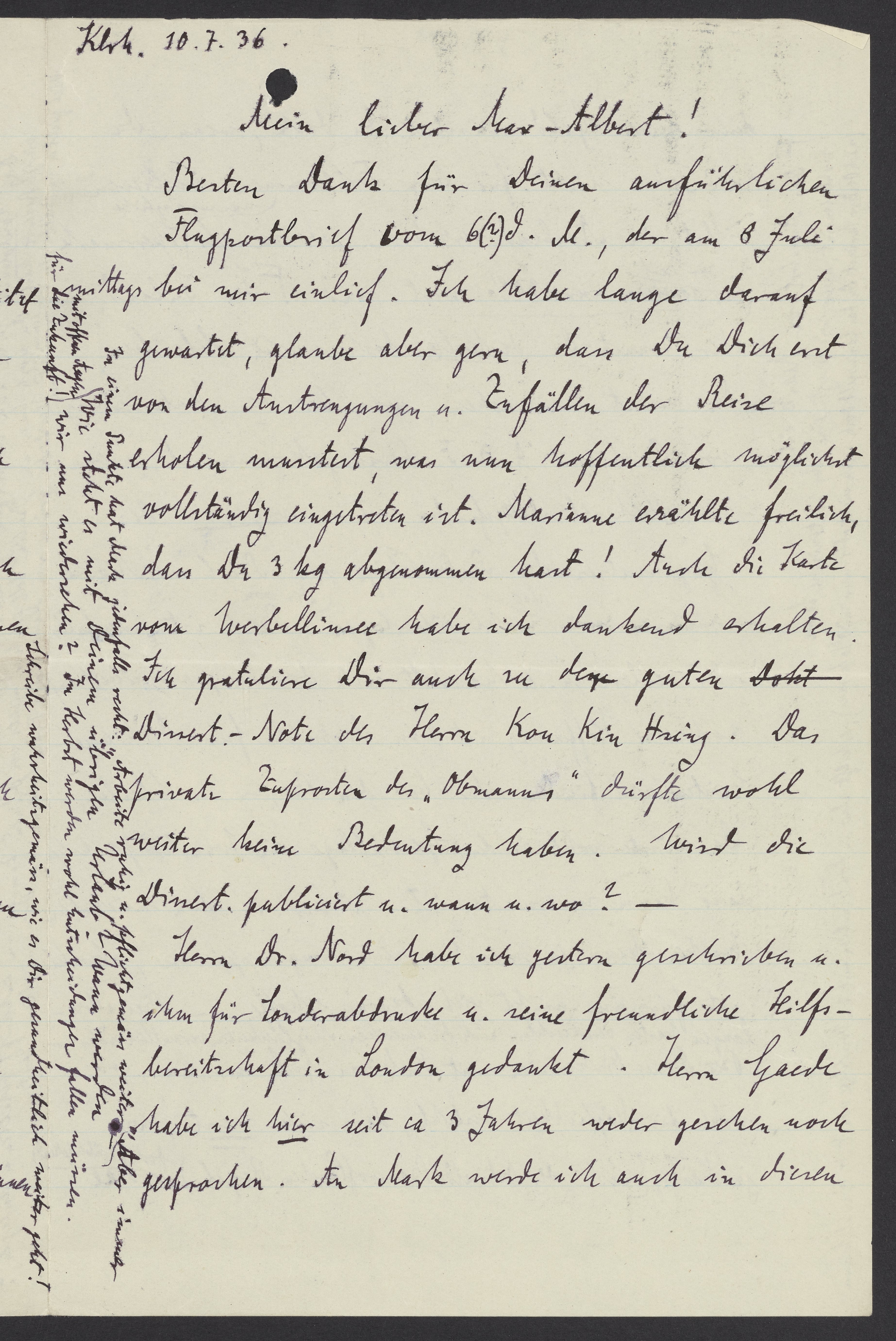 Herrn Dr. Nord habe ich gestern geschrieben u. ihm für Sonderabdrucke u. reine freundliche Hilfsbereitschaft in London gedankt. Herr Gaede habe ich hier seit 3 Jahren weder gesehen noch gesprochen. An Mark werde ich auch in diesen