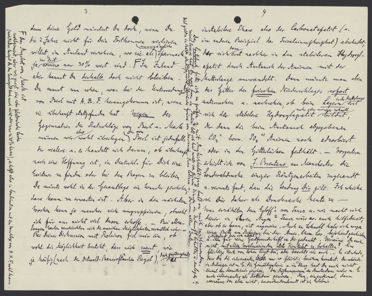 the more unstable phase, i.e., the carbonate apatite (and in the other example the free calcium phosphate), separates out, and only later transforms into the more stable hydroxyapatite through exchange of the anions with bittern. Next, you would have to immediately examine the lattice of the fresh precipitate and check if the more stable hydroxyapatite forms during storage in bittern, which adsorbs during the exchange of CO3, or to be precise PO4, or is retained in the lattice gaps. The day before yesterday, I received the reprints of some X-ray publications from J. Brentano in Manchester. I assume the package is for you. I am therefore sending them to you as printed matter today.