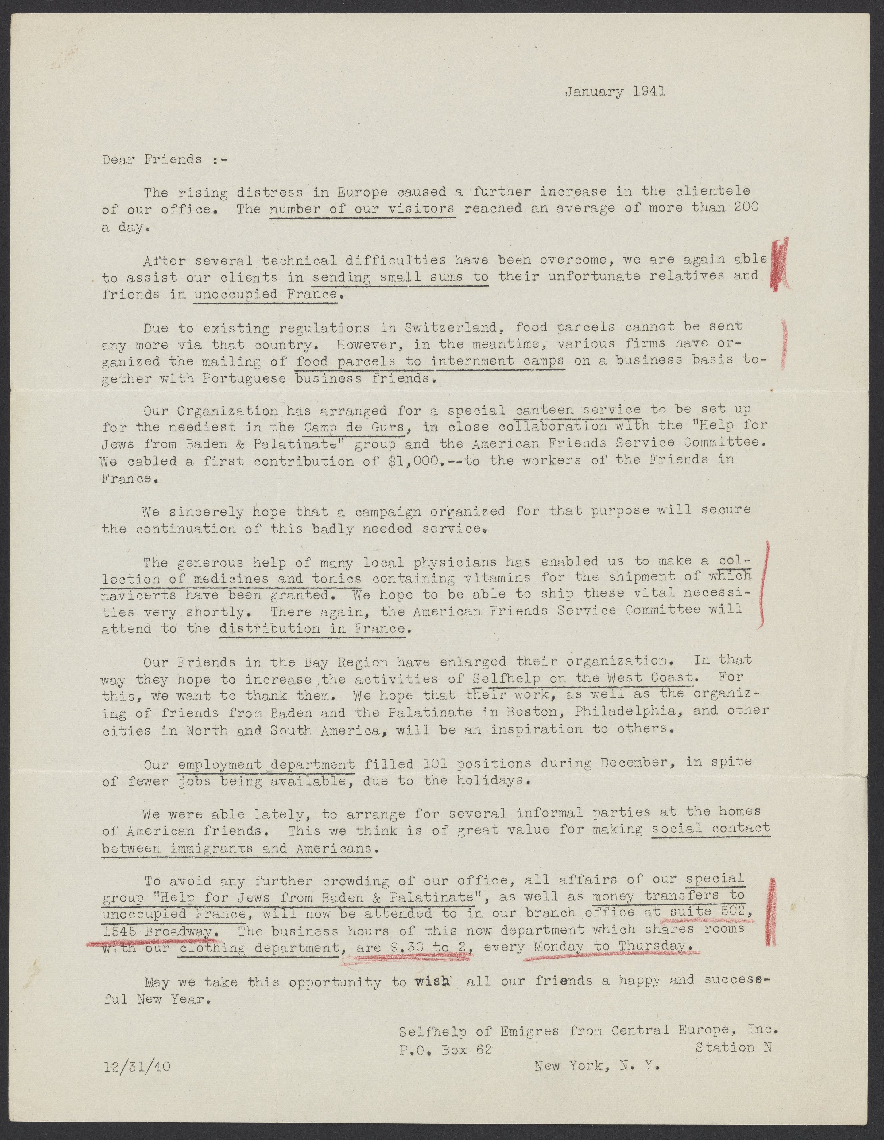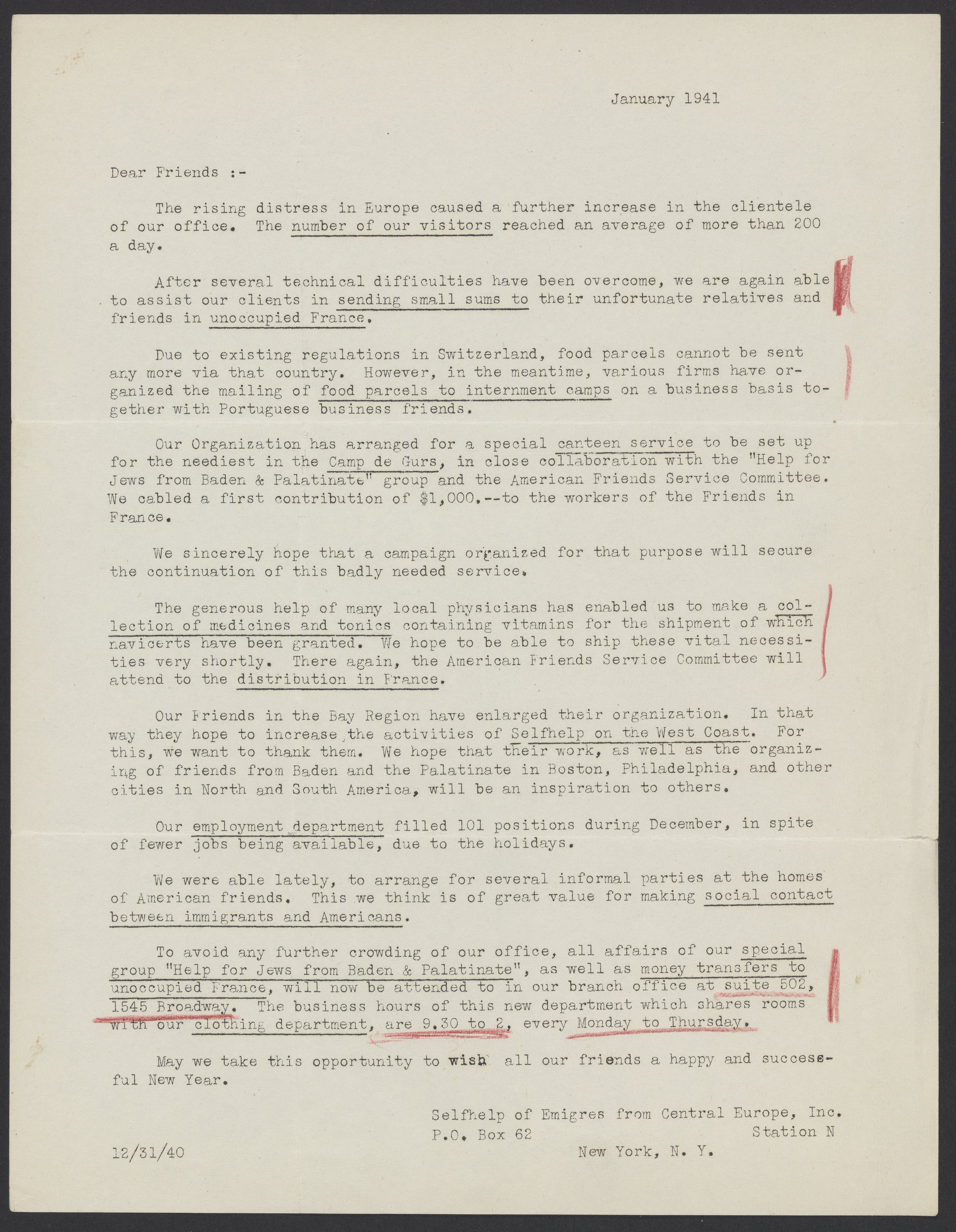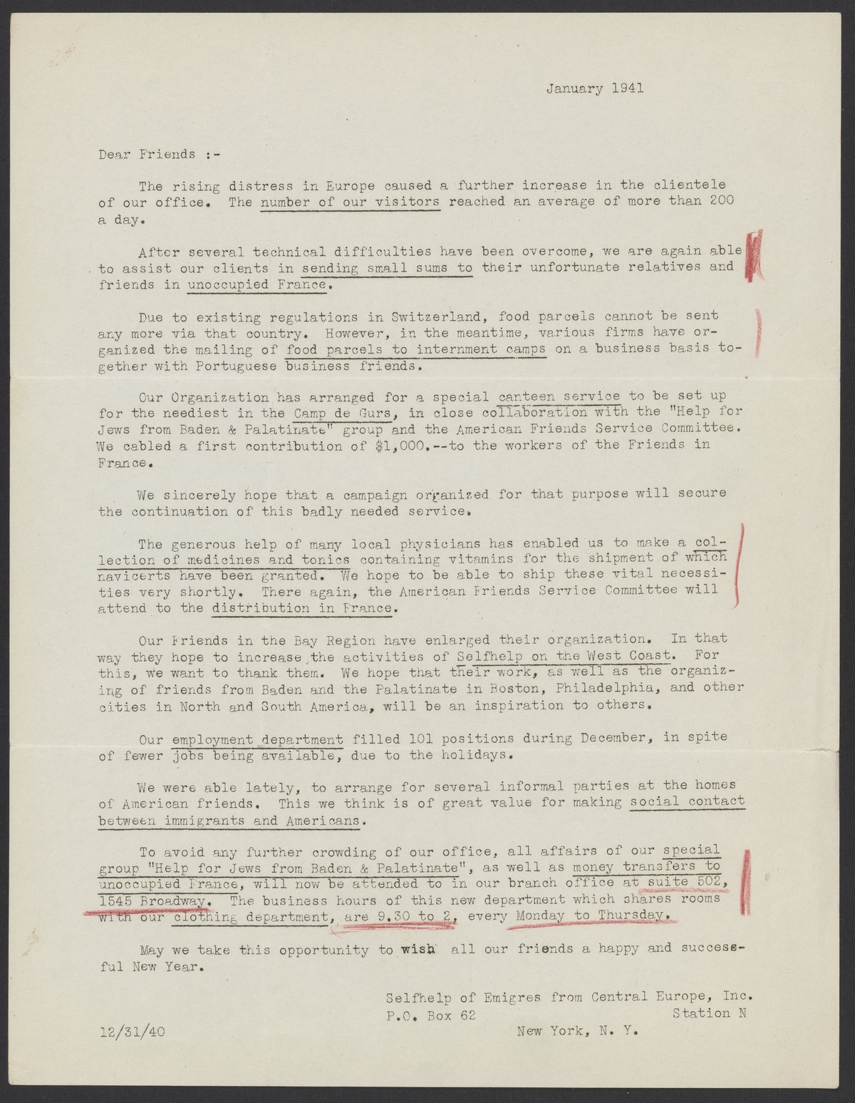 Letter from SelfHelp of Emigres from Central Europe, January 1941