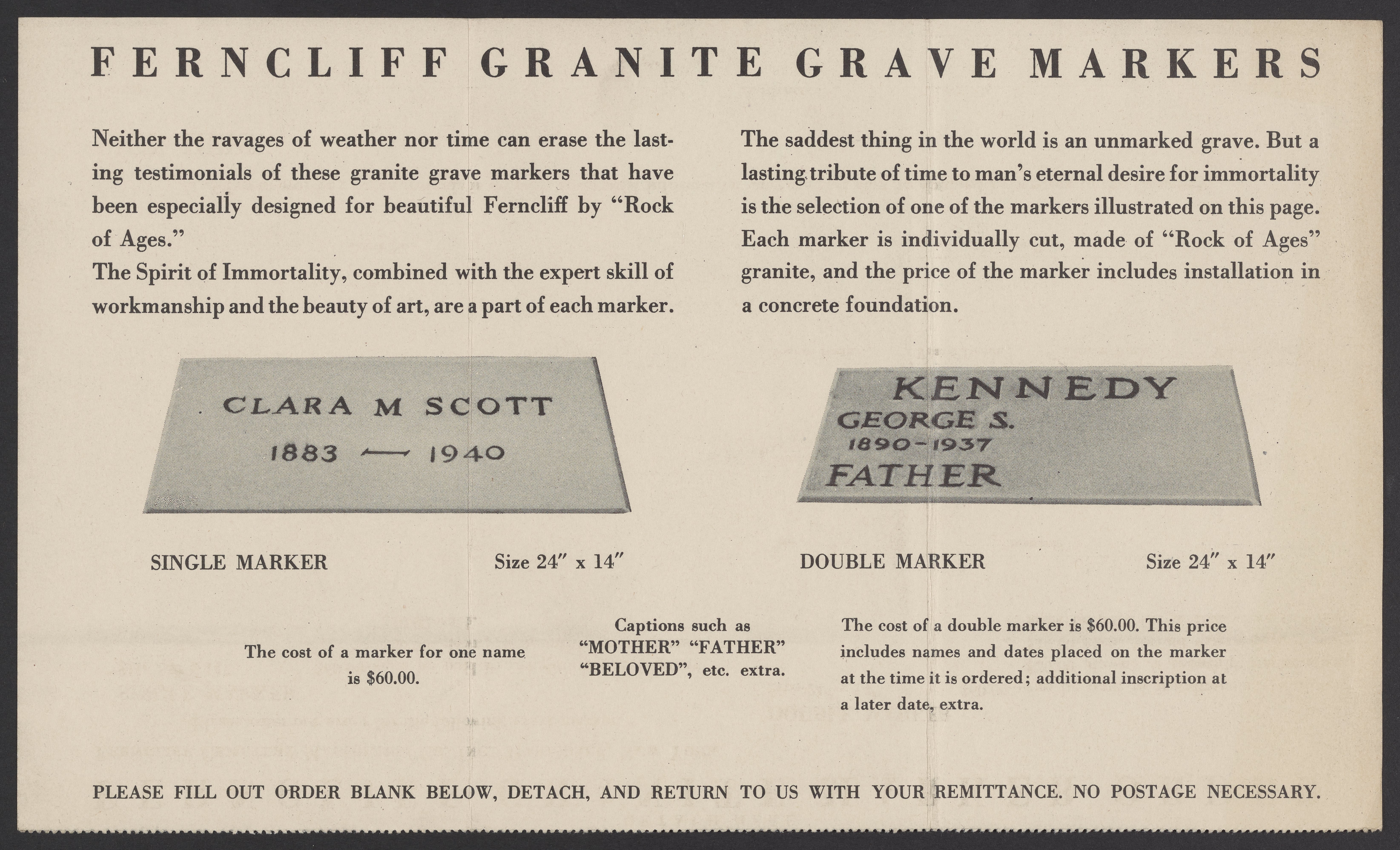 Ferncliff Granite Grave Markers. “Ferncliff Granite Grave Markers,” 1944. Papers of Georg and Max Bredig, Box 10, Folder 13. Science History Institute. Philadelphia. https://digital.sciencehistory.org/works/5kcbg49.