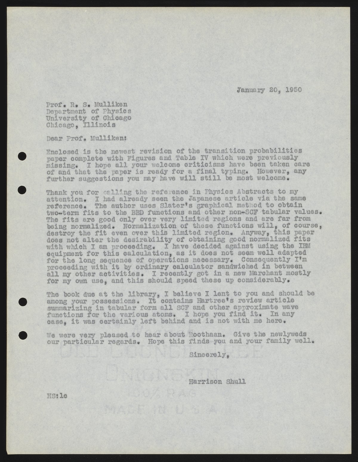 Shull, Harrison. “Letter from Harrison Shull to Robert S. Mulliken, 1950,” January 20, 1950. Robert S. Mulliken & Harrison Shull Correspondence, Box 1. Science History Institute. Philadelphia. https://digital.sciencehistory.org/works/5m60qs01p.