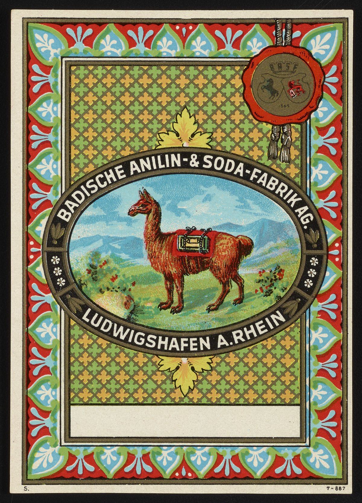 “Badische Anilin & Soda-Fabrik Dye Label with Alpaca.” Dye transfer prints. Ludwigshafen am Rhein, Germany: Badische Anilin- & Soda-Fabrik, circa 1900. Science History Institute. Philadelphia. https://digital.sciencehistory.org/works/5m60qs97h.