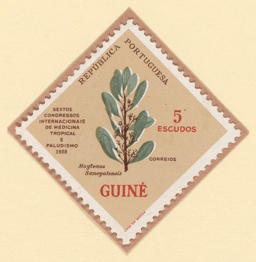 1958 stamp from Macau, which was a Portuguese overseas province in West Africa from 1588 until 1974. The stamp features a botanical illustration of Maytenus senegalensis. Maytenus senegalensis, also known as spike thorn, is a versatile medicinal plant used in African traditional medicine. It is used to treat malaria, digestive issues, skin conditions, respiratory infections (pneumonia), and rheumatism.