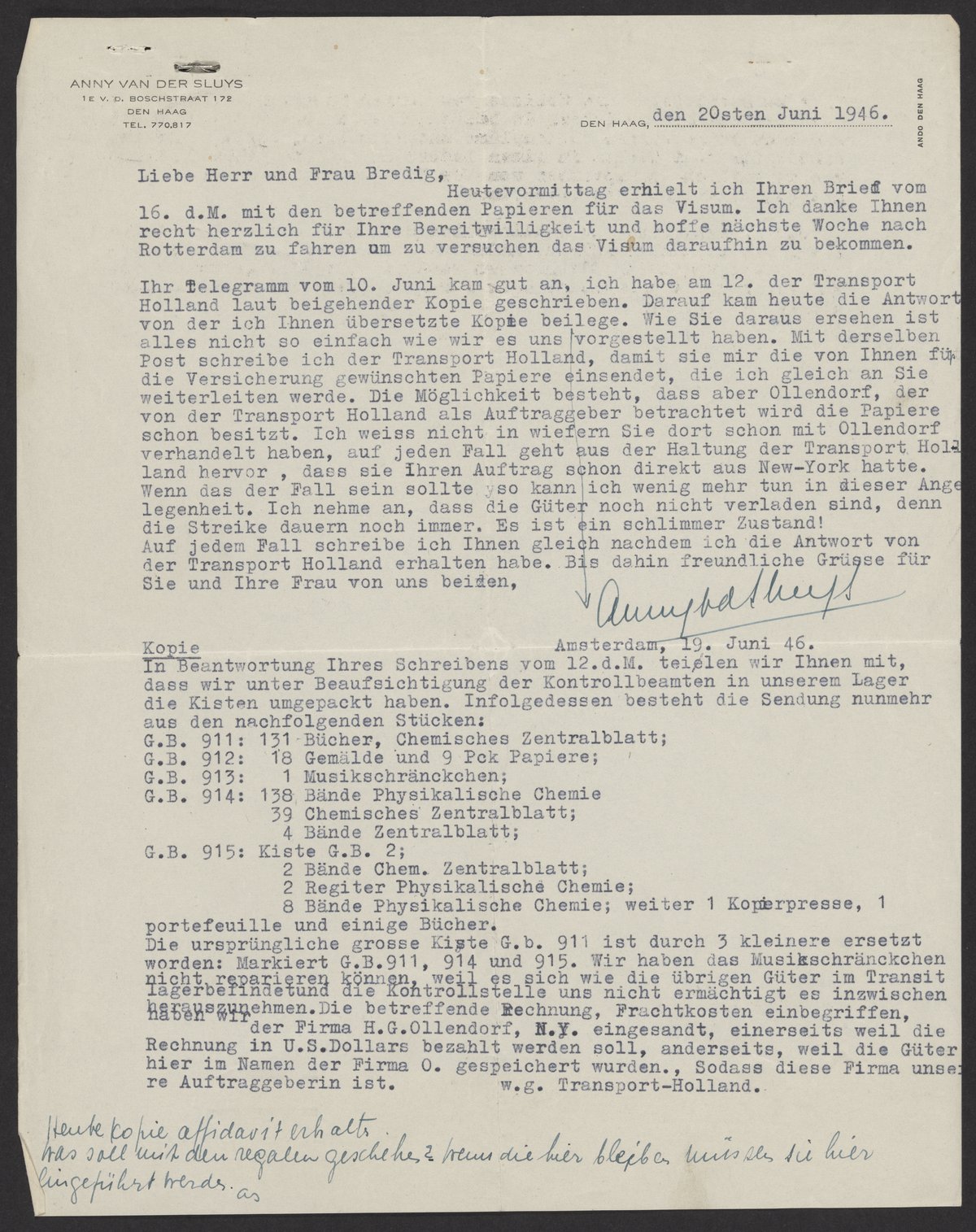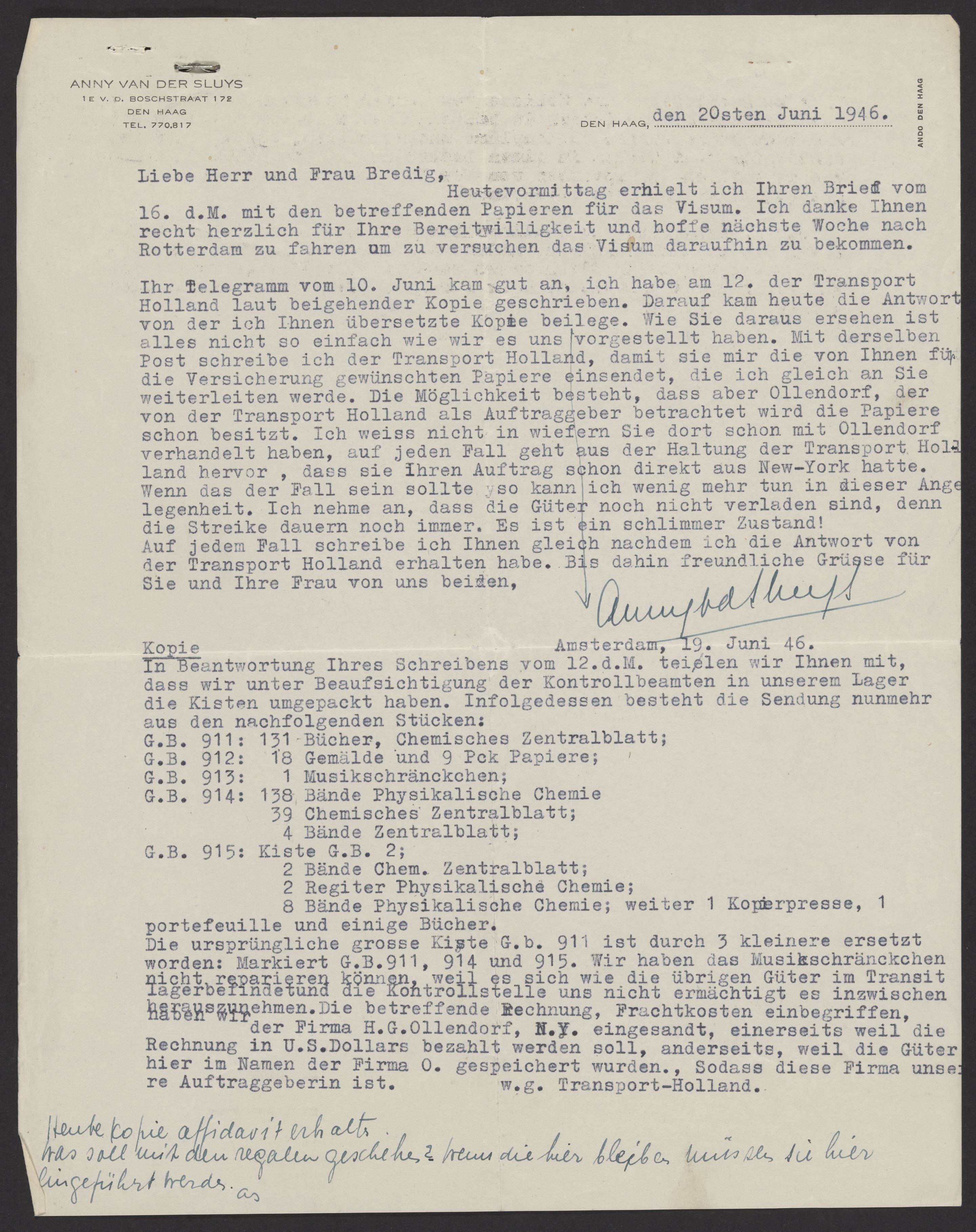 Anny van der Sluys writes to Max Albert Bredig (1902-1977) and Lydia R. Bredig nee Levy, regarding the transportation of his father's, Georg Bredig (1868-1944), luggage from Holland to New York.