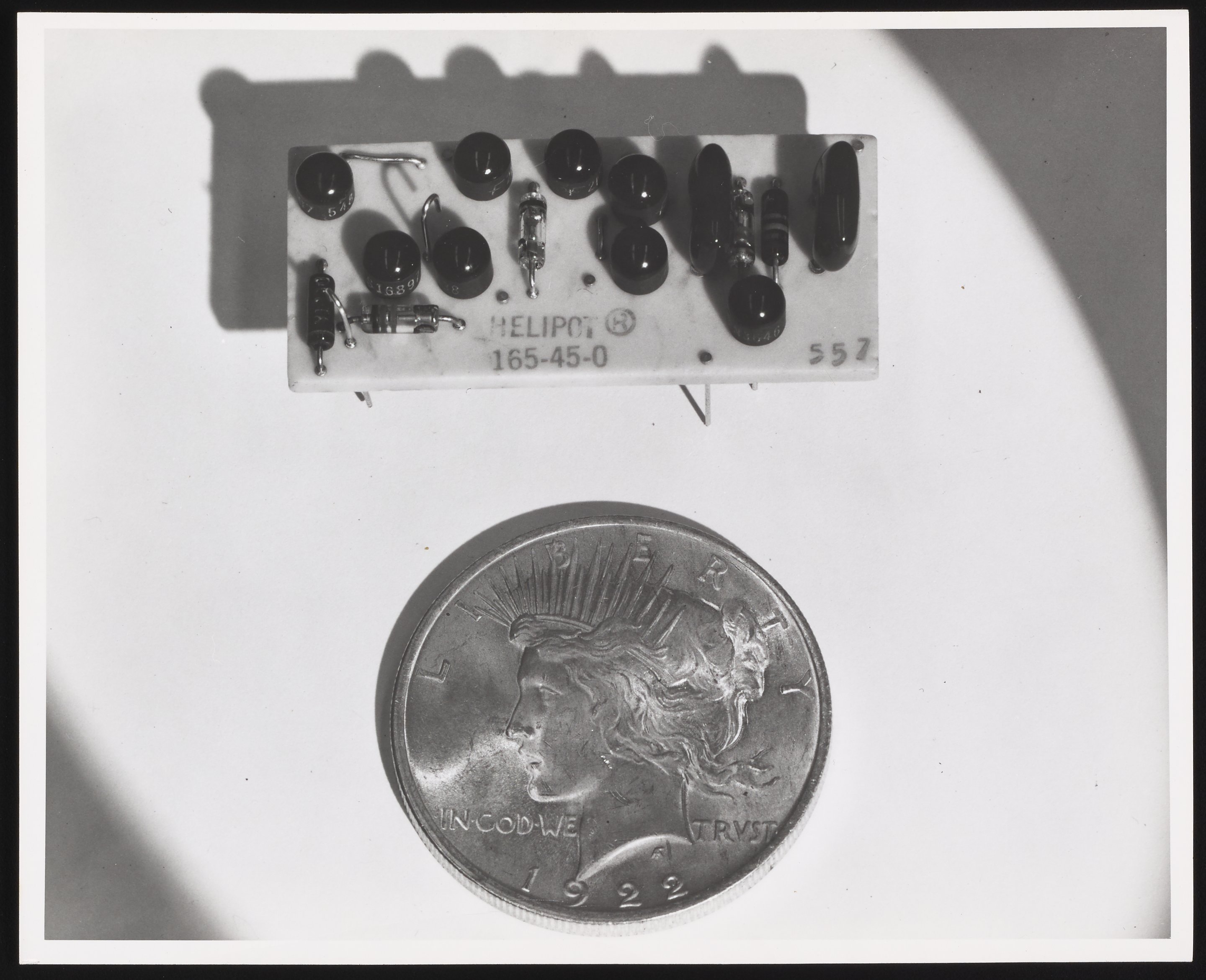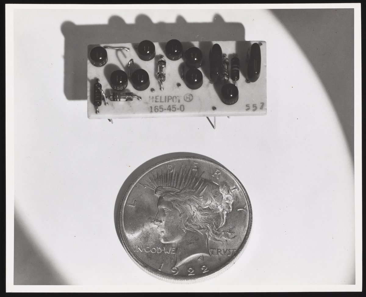 Helipot microcircuits were used in the instruments designed by Beckman's Systems Division. The U.S. quarter provides scale.