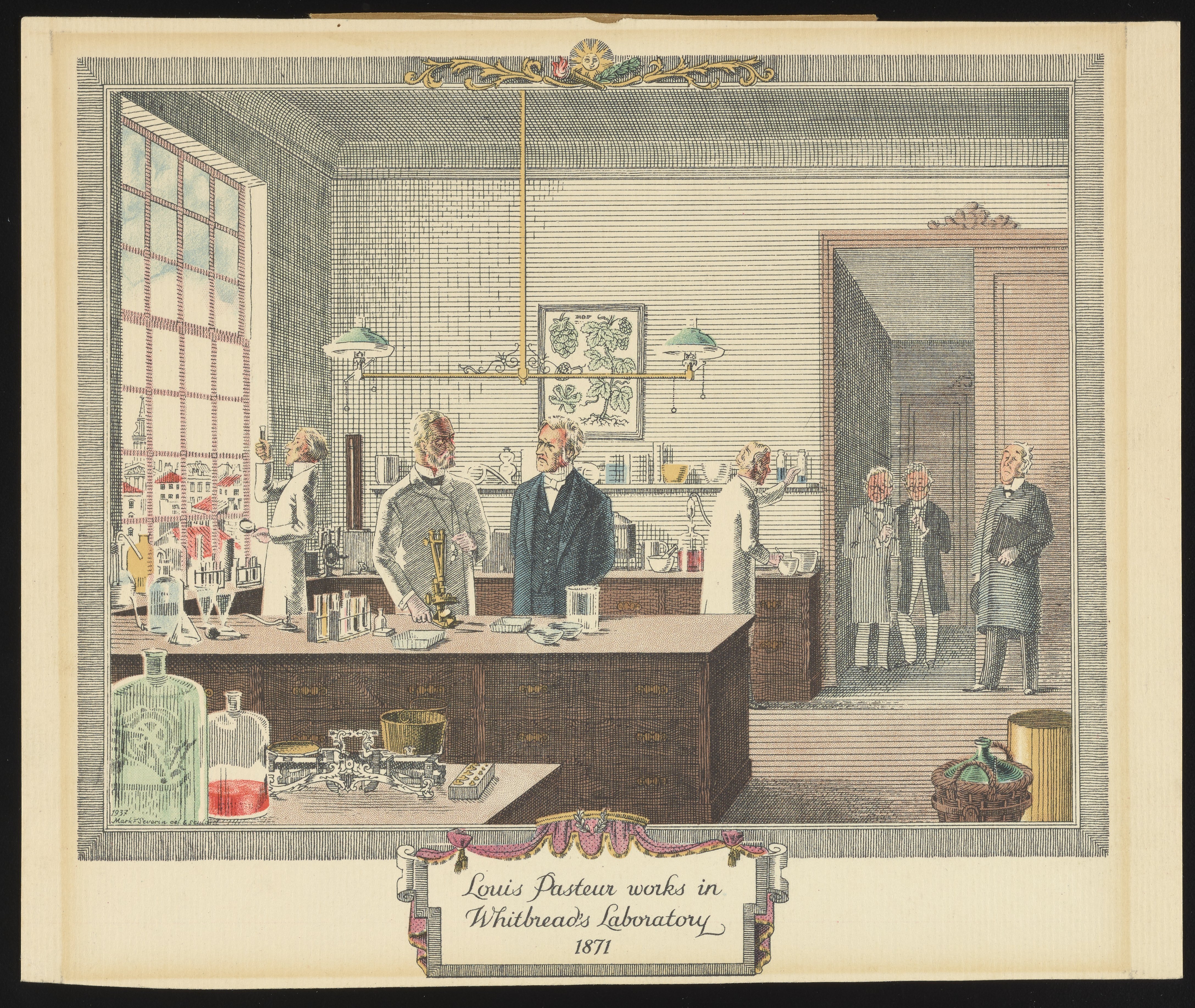 Colored engraving depicting Louis Pasteur at work in the laboratory of Whitbread's Brewery in London in 1871