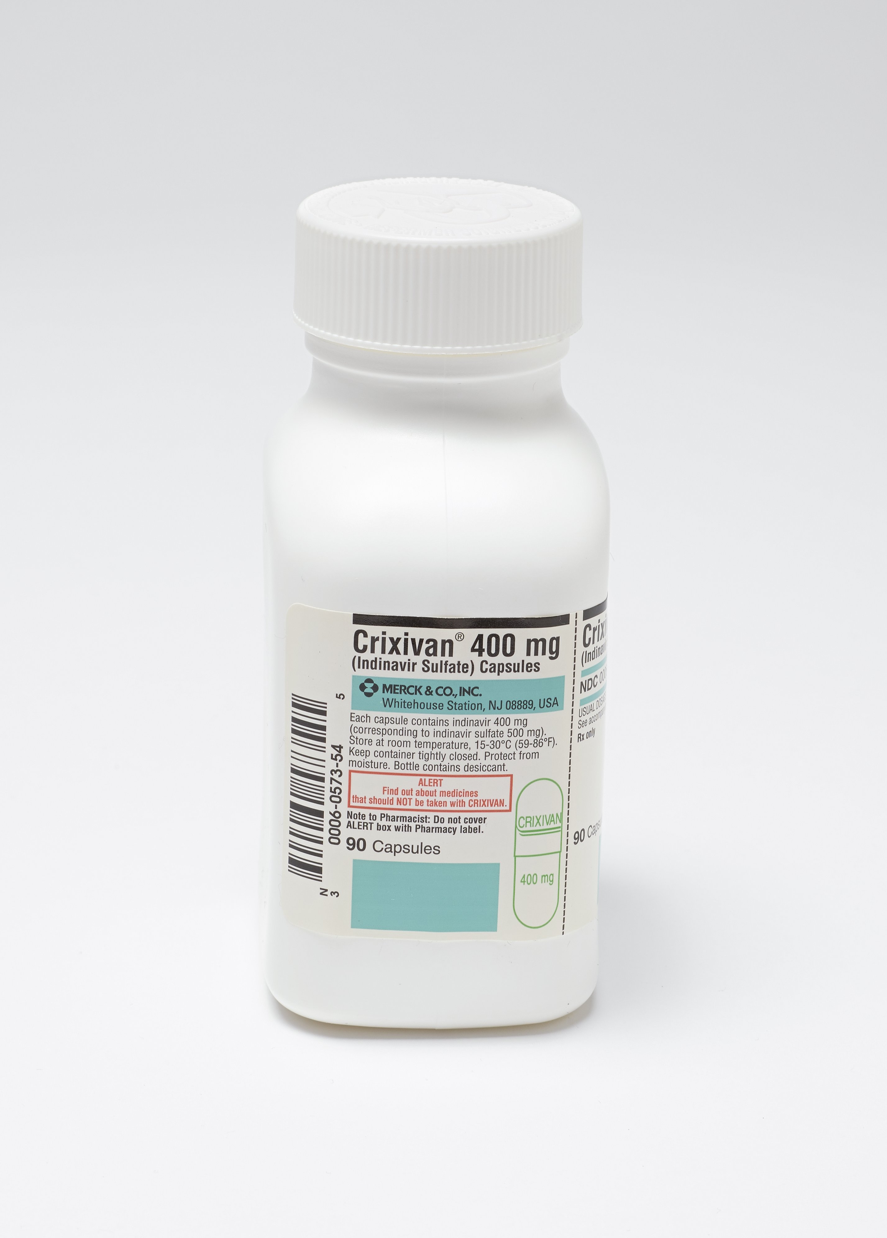 Science History Institute. Bottle for Crixivan 400 Mg HIV Protease Inhibitor. Photograph, 2017. Science History Institute. Philadelphia. https://digital.sciencehistory.org/works/5q47rp19n.