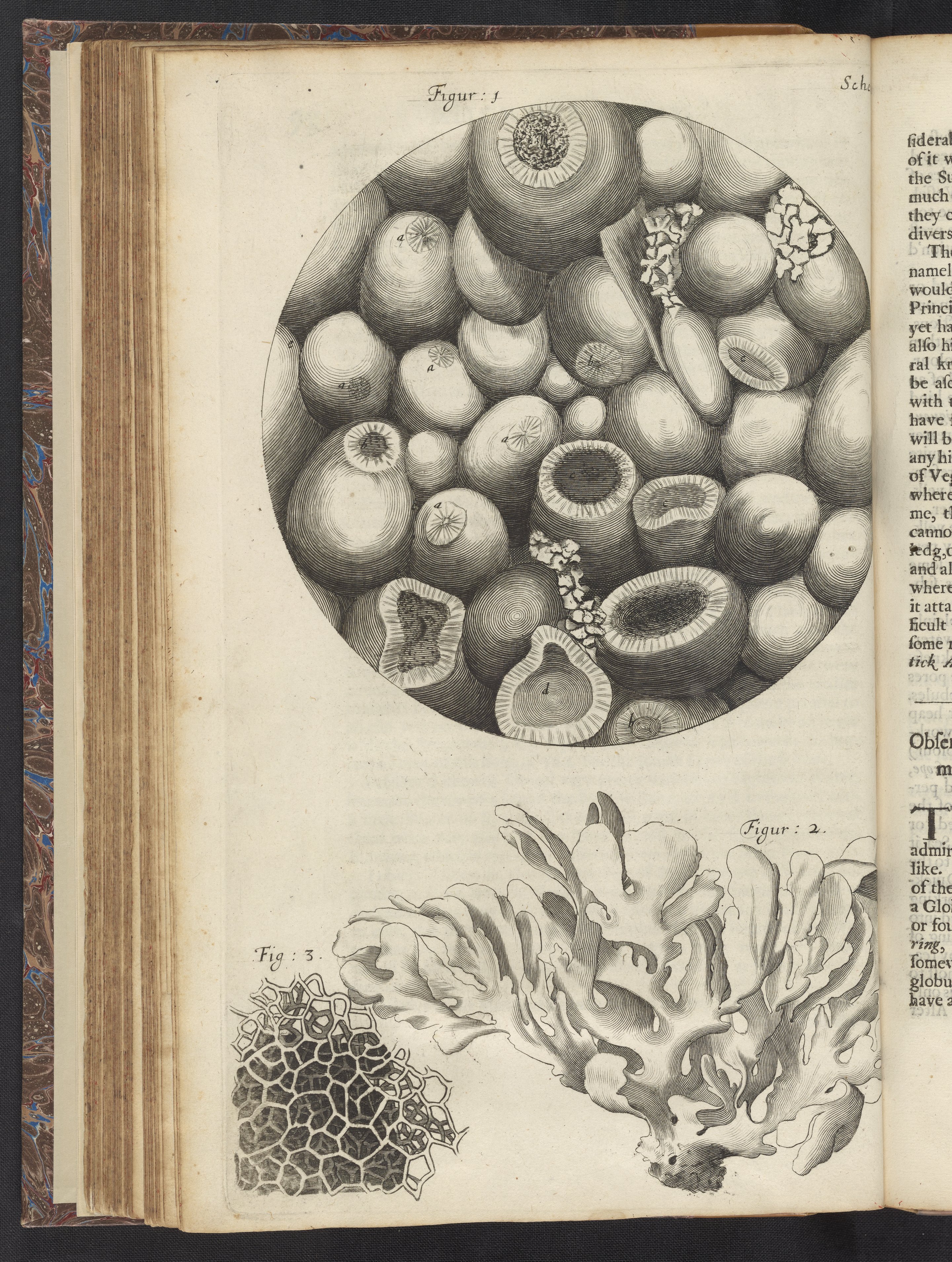 Hooke, Robert. “Microscopic View of Kettering-Stone, Sea Moss, and Sponge.” In Micrographia : or, Some Physiological Descriptions of Minute Bodies Made by Magnifying Glasses. With Observations and Inquiries Thereupon. London, England: J. Allestry, 1665. https://digital.sciencehistory.org/works/5q47rq09m.