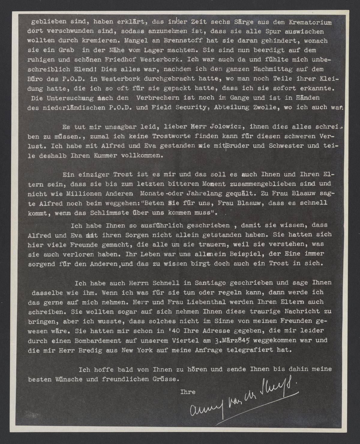 Es tut mir leid für Sie und besonders für Ihre Eltern, dass Sie die tragische Nachricht über Alfred und Eva durch ein Telegramm erfahren mussten. Ich hätte Ihnen das gerne erspart, aber meine Freundin Cilia Loots hatte das Telegramm schon abgesandt. Vielleicht hat sie auch Recht gehabt, denn ich selbst habe mehr als sieben Monate in Unsicherheit über ihr Los gelebt und weiss was das bedeutet. Damit Sie einigermassen im Bilde sind über mein Verhältnis zu Ihrer Schwester und Alfred muss ich Ihnen erzählen, dass ich Eva damals kennen gelernt habe als sie nach Holland kam bei der Familie Liebenthal, mit ich sehr befreundet war. Als sie nach ihrer Heirat in der Riouwstr. wohnte habe ich sie öfters besucht. Eine tiefe Freundschaft zwischen uns ist aber erst entstanden, als sie in '40 von den Haag weg mussten. Es wurde Ihnen dann keine Zeit gelassen ihre Sachen zu packen und ich habe ihre ganzen Sachen gepackt und nachgeschickt. Auch in Amersfoort besuchte ich sie oft. Vielleicht haben sie Ihnen mal davon erzählt. Weil ich annehme, dass es Sie interessiert, was hier alles vorgegangen ist in den letzten Jahren, will ich es Ihnen genau berichten, wie ich es auch Alfreds Bruder in Santiago getan habe.