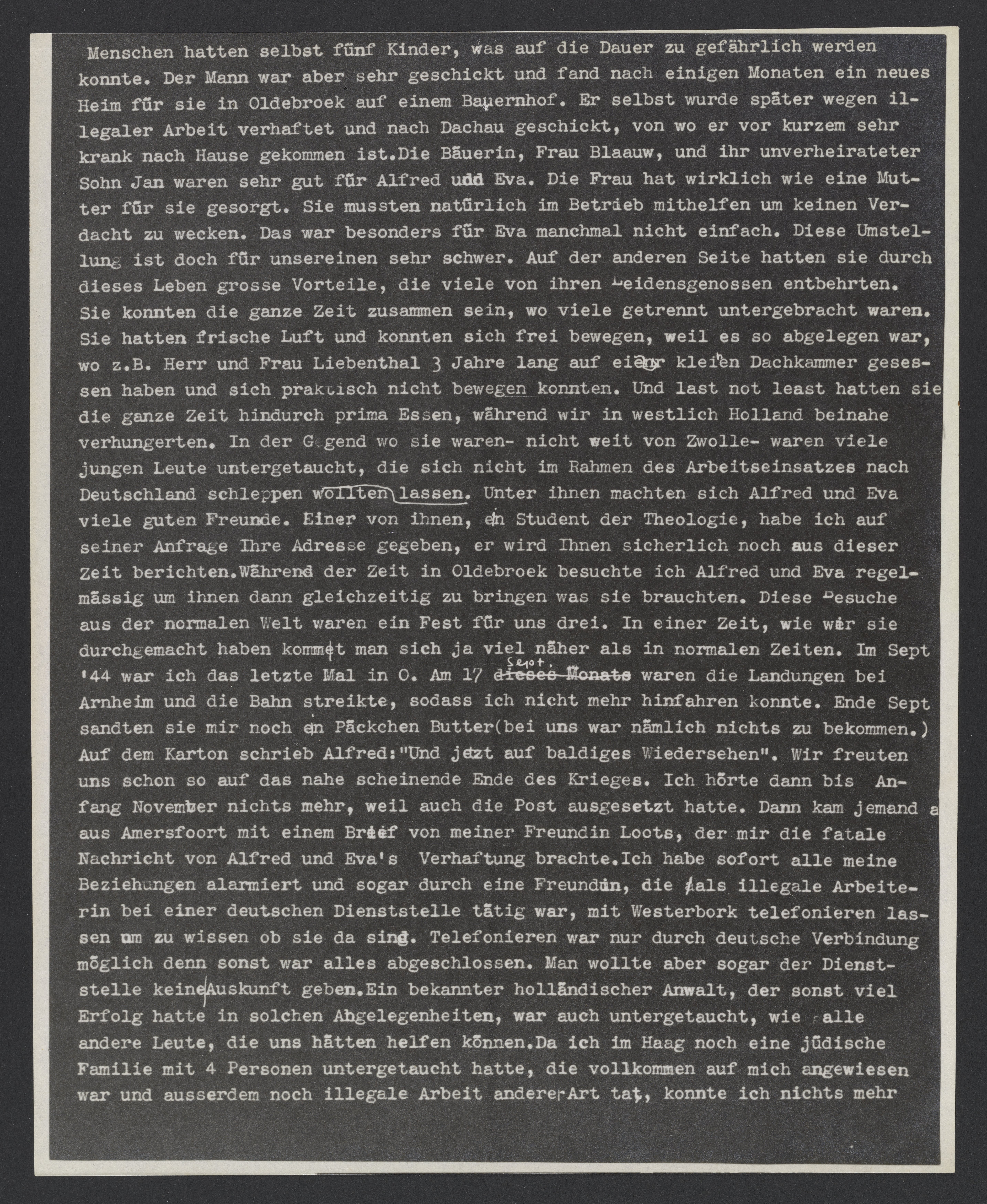 Menschen hatten selbst fünf Kinder, was auf die Dauer zu gefährlich werden konnte. Der Mann war aber sehr geschickt und fand nach einigen Monaten ein neues Heim für sie in Olderbroek auf einem Bauernhof. Er selbst wurde später wegen illegaler Arbeit verhaftet und nach Dachau geschickt, von wo er vor kurzem sehr krank nach Hause gekommen ist. Die Bäuerin, Frau Blaaw, und ihre unverheirateter Sohn Jan waren sehr gut für Alfred und Eva. Die Frau hat wirklich wie eine Mutter für sie gesorgt. Sie mussten natürlich im Betrieb mithelfen um keinen Verdacht zu wecken. Das war besonders fuer Eva manchmal nicht einfach. Diese Umstellung ist doch für unsereinen sehr schwer. Auf der anderen Seite hatten sie durch dieses Leben grosse Vorteile, die viele von ihren Leidensgenossen entbehrten. Sie konnten die ganze Zeit zusammen sein, wo viele getrennt untergebracht waren. Sie hatten frische Luft und konnten sich frei bewegen, weil es so abgelegen war, wo z.B. Herr und Frau Liebenthal 3 Jahre lange auf einer kleinen Dachkammer gesessen und sich praktisch nicht bewegten konnten. Und last not least hatten sie die ganze Zeit hindurch prima Essen, wahrend wir in westlich Holland beinahe verhungerten. In der Gegend wo sie waren – nicht weit von Zwolle – waren viele jungen Leute untergetaucht, die sich nicht im Rahmen des Arbeitseinsatzes nach Deutschland schleppen lassen wollten. Unter ihnen machten sich Alfred und Eva viele gute Freunde. Eine von ihnen, ein Student der Theologie, habe ich auf seiner Anfrage Ihre Adresse gegeben, er wird Ihnen sicherlich noch aus dieser Zeit berichten. Während der Zeit in Olderbroek besuchte ich Alfred und Eva regelmäßig um ihnen dann gleichzeitig zu bringen was sie brauchten. Diese Besuche aus der normalen Welt waren ein Fest für uns drei. In einer Zeit, wie wir sie durchgemacht haben, kommt man sich ja viel näher als in normalen Zeiten. Im Sept 44 war ich das letzte Mal in O. Am 17 Sept. waren die Landungen bei Arnhelm und die Bahn streikte, sodass ich nicht mehr hinfahren konnte. Ende Sept sandten sie mir noch ein Päckchen Butter (bei uns war nämlich nichts zu bekommen.) Auf dem Karton schrieb Alfred: "Und jetzt auf baldiges Wiedersehen." Wir freuten uns schon so auf das nahe scheinende Ende des Krieges. Ich hörte dann bis Anfang November nichts mehr, weil auch die Post ausgesetzt hatte. Dann kam jemand aus Amersfoort mit einem Brief von meiner Freundin Loots, der mir fatale Nachricht von Alfred und Eva’s Verhaftung brachte. Ich habe sofort alle meine Beziehungen alarmiert und sogar durch eine Freundin, die als illegale Arbeiterin bei einer deutschen Dienststelle tätig war, mit Westerbork telefonieren lassen um zu wissen ob sie da sind. Telefonieren war nur durch deutsche Verbindung denn sonst war alles abgeschlossen. Man wollte aber sogar der Dienststelle keine Auskunft geben. Ein bekannter holländischer Anwalt, der sonst viel Erfolg hatte in solchen Angelegenheiten, war auch untergetaucht wie alle andere Leute, die uns hätten helfen können. Da ich im Haag noch eine jüdische Familie mit 4 Personen untergetaucht hatte, die vollkommen auf mich angewiesen war und ausserdem noch illegale Arbeit anderer Art tat, konnte ich nichts mehr