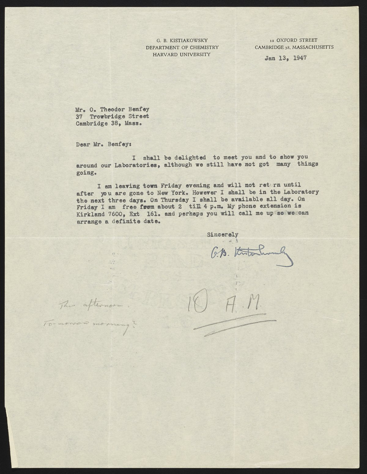 Kistiakowsky, George B. (George Bogdan). “Letter from G. B. Kistiakowsky to Theodor Benfey,” January 13, 1947. Benfey Autographed Letter Collection, Box 1. Science History Institute. Philadelphia. https://digital.sciencehistory.org/works/5t34sj58c.