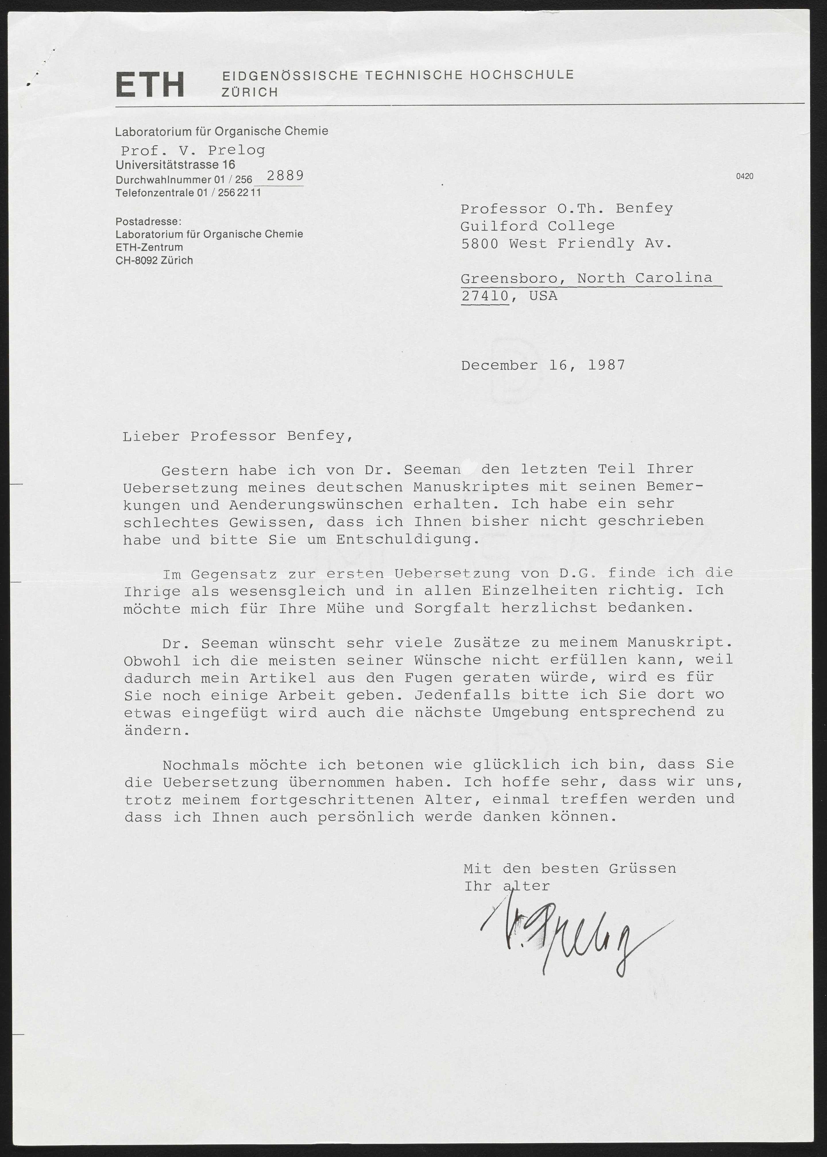 Prelog, V. (Vladimir). “Letter from Vladimir Prelog to Theodore Benfey,” December 16, 1987. Benfey Autographed Letter Collection, Box 1. Science History Institute. Philadelphia. https://digital.sciencehistory.org/works/5t34sj59n.