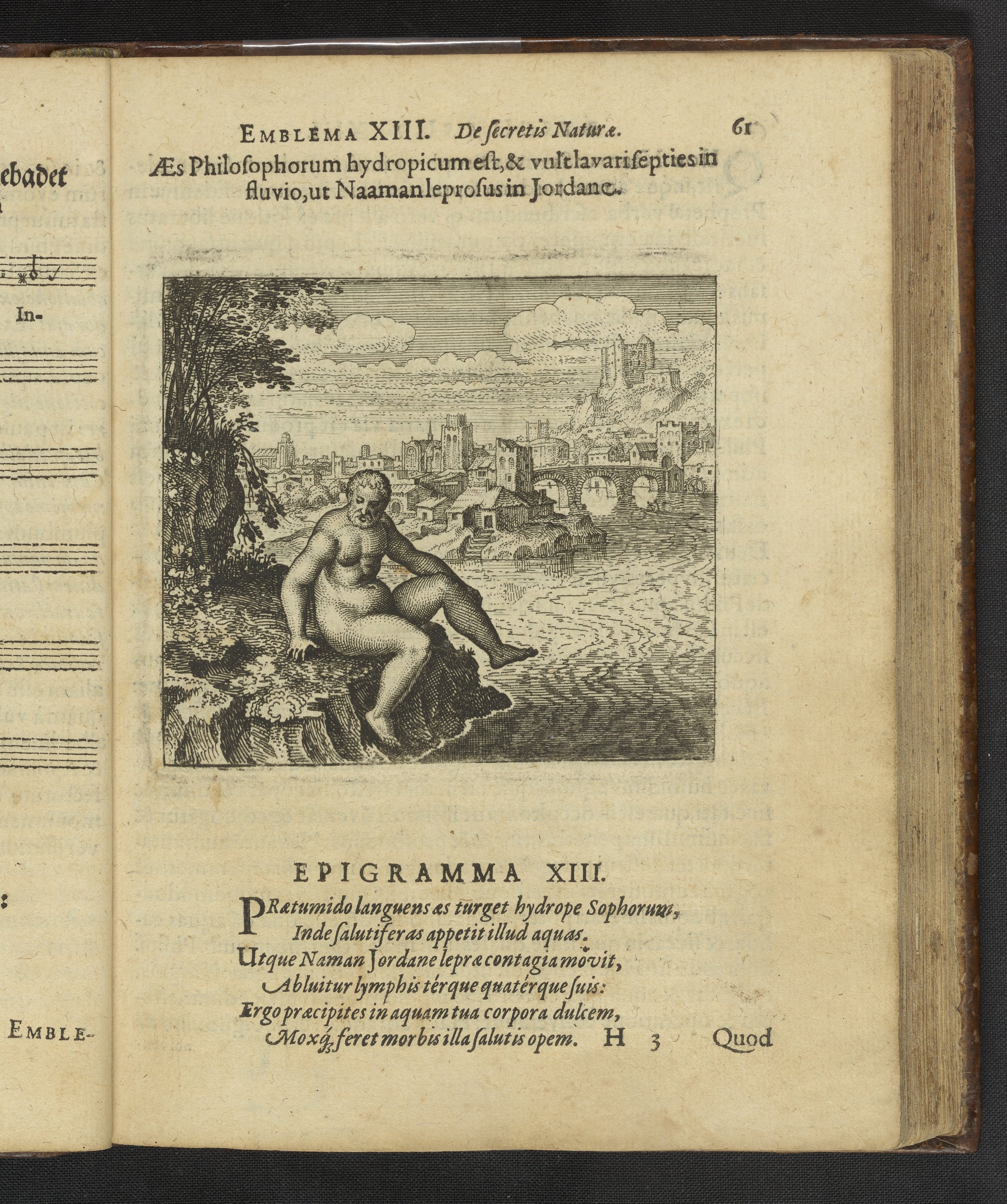Emblema XIII. Æs Philosophorum hydropicum est, & vult lavari septies in fluvio, ut Naaman leprosus in Jordane.