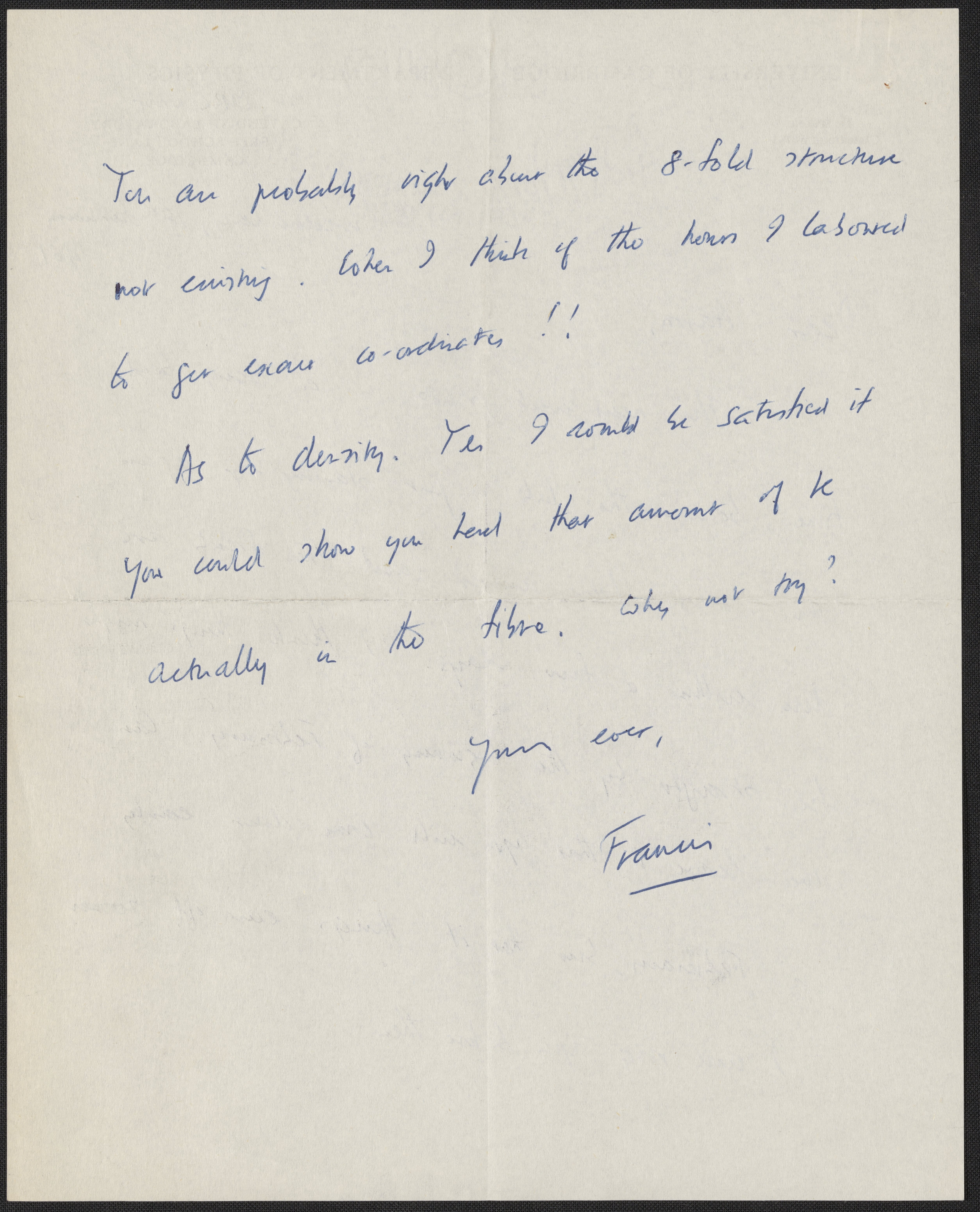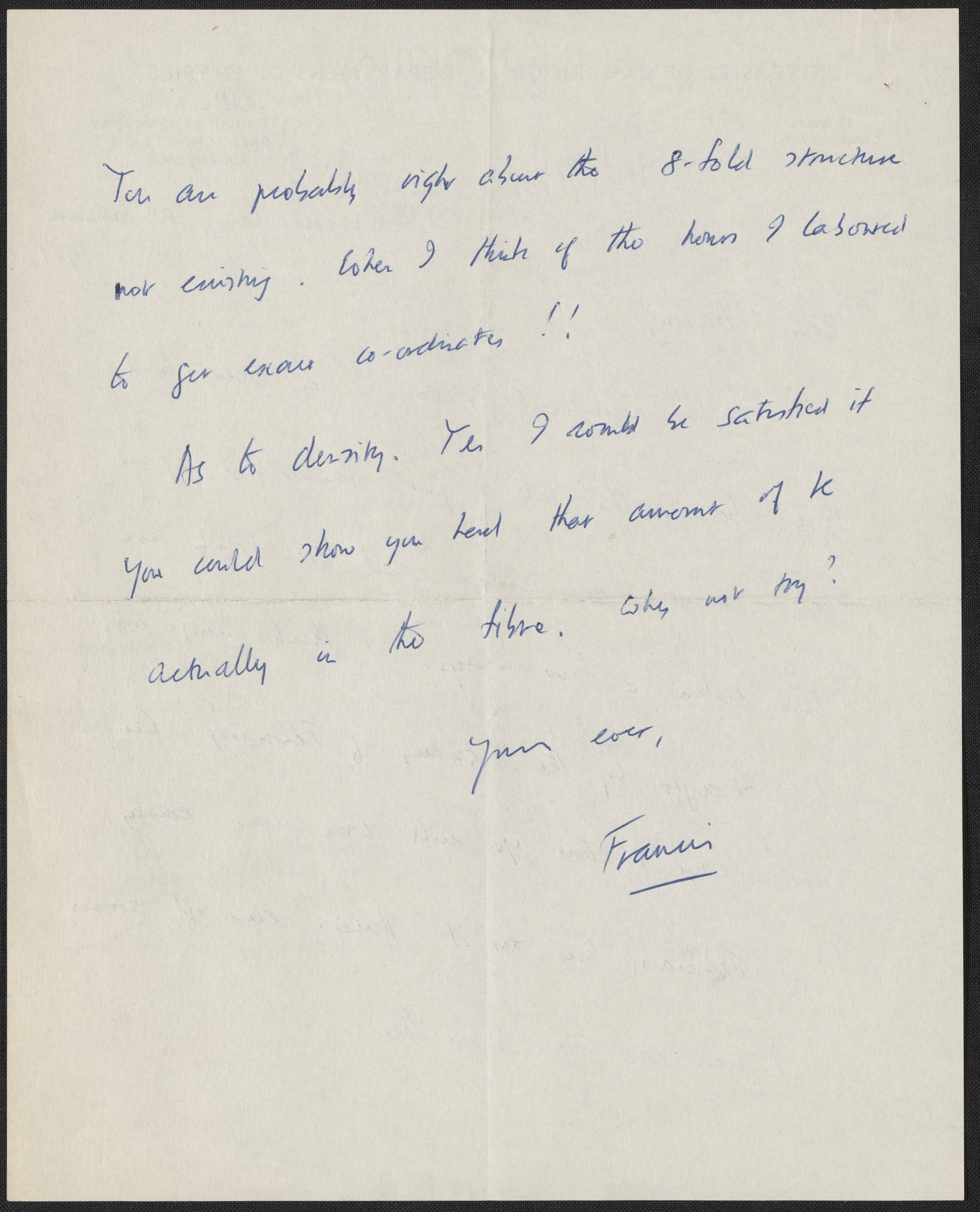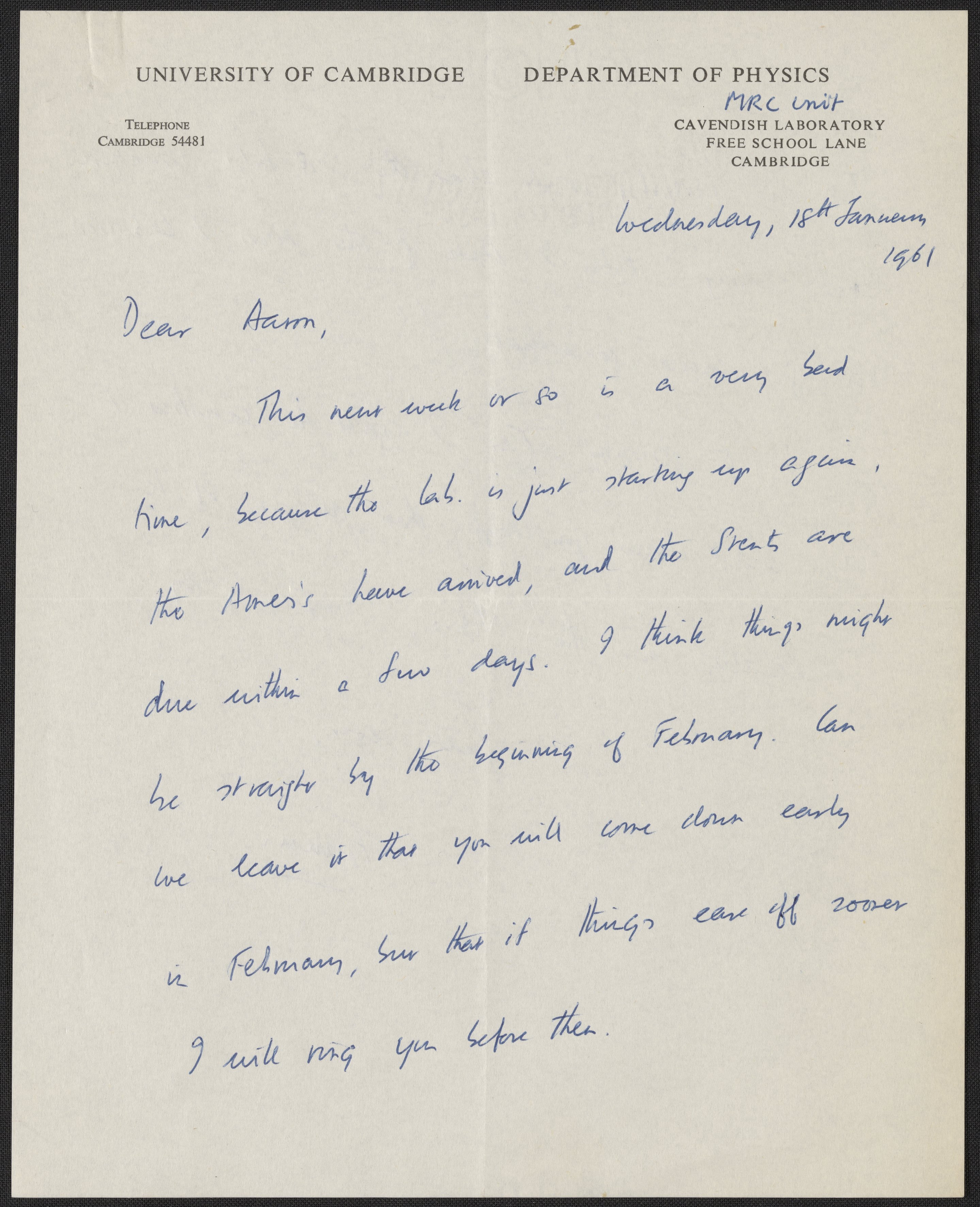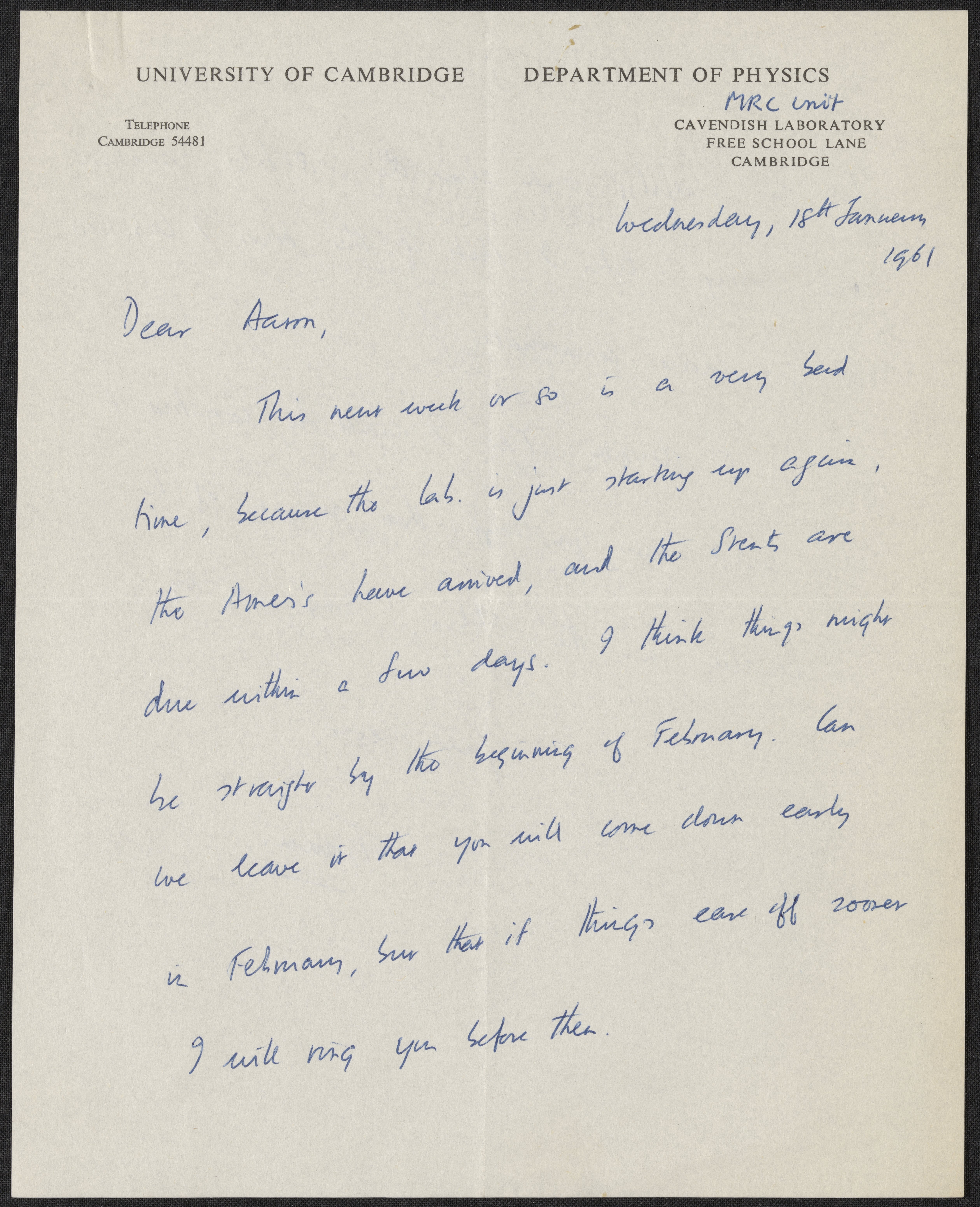 Crick, Francis. “Letter from Francis Crick to Aaron Klug, January 18, 1961,” January 18, 1961. History of Molecular Biology Collection, Box 19, Folder 20. Science History Institute. Philadelphia. https://digital.sciencehistory.org/works/5vblg40.