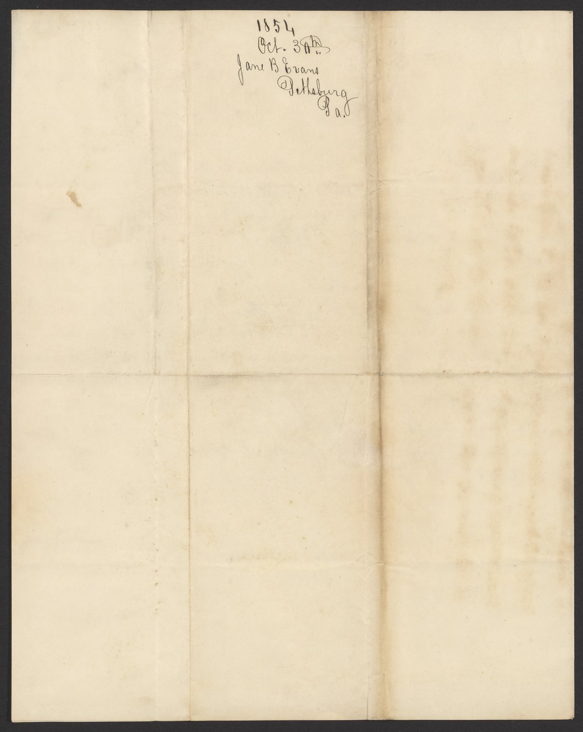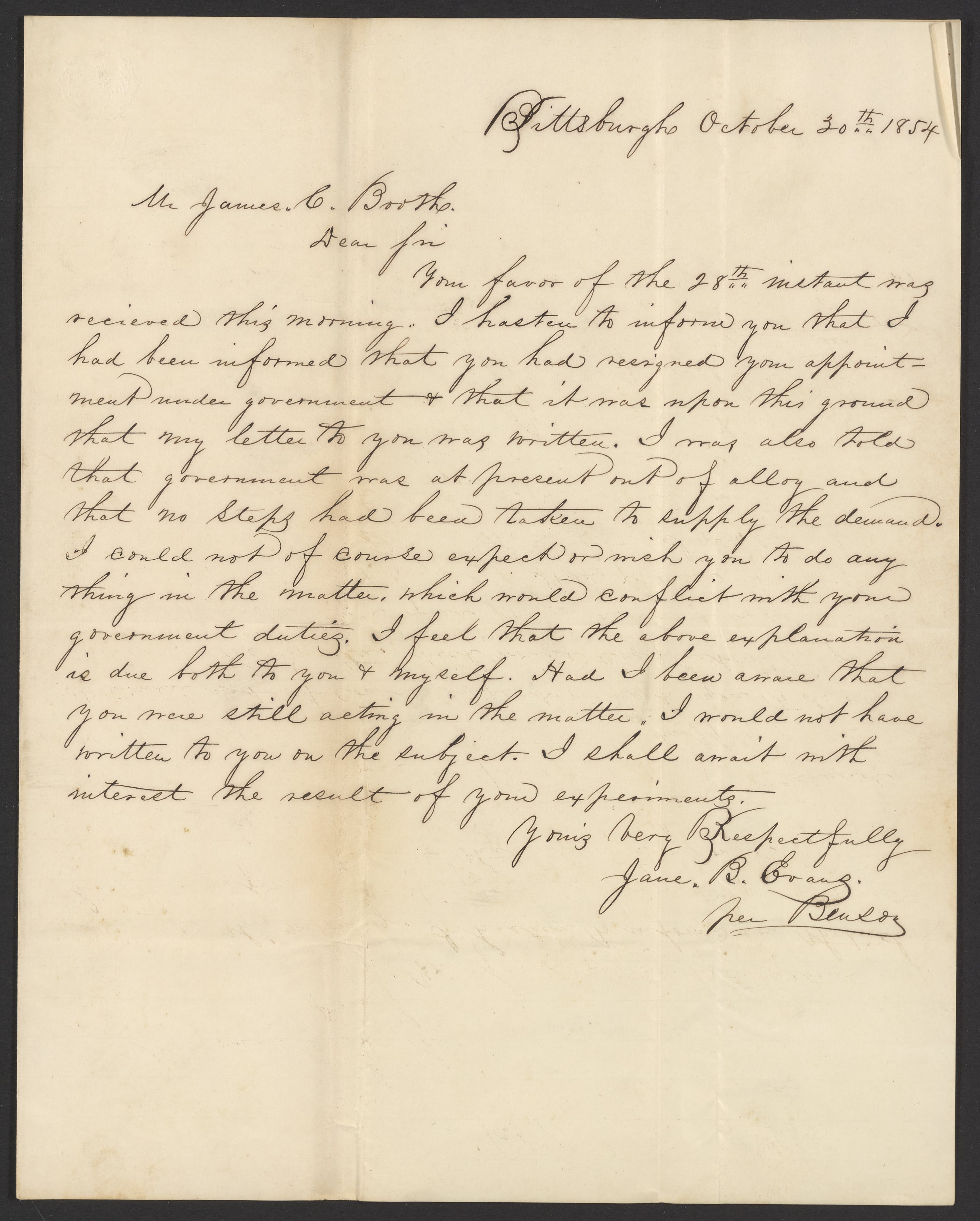 Letter from Jane B. Evans to James Curtis Booth, October 30, 1854