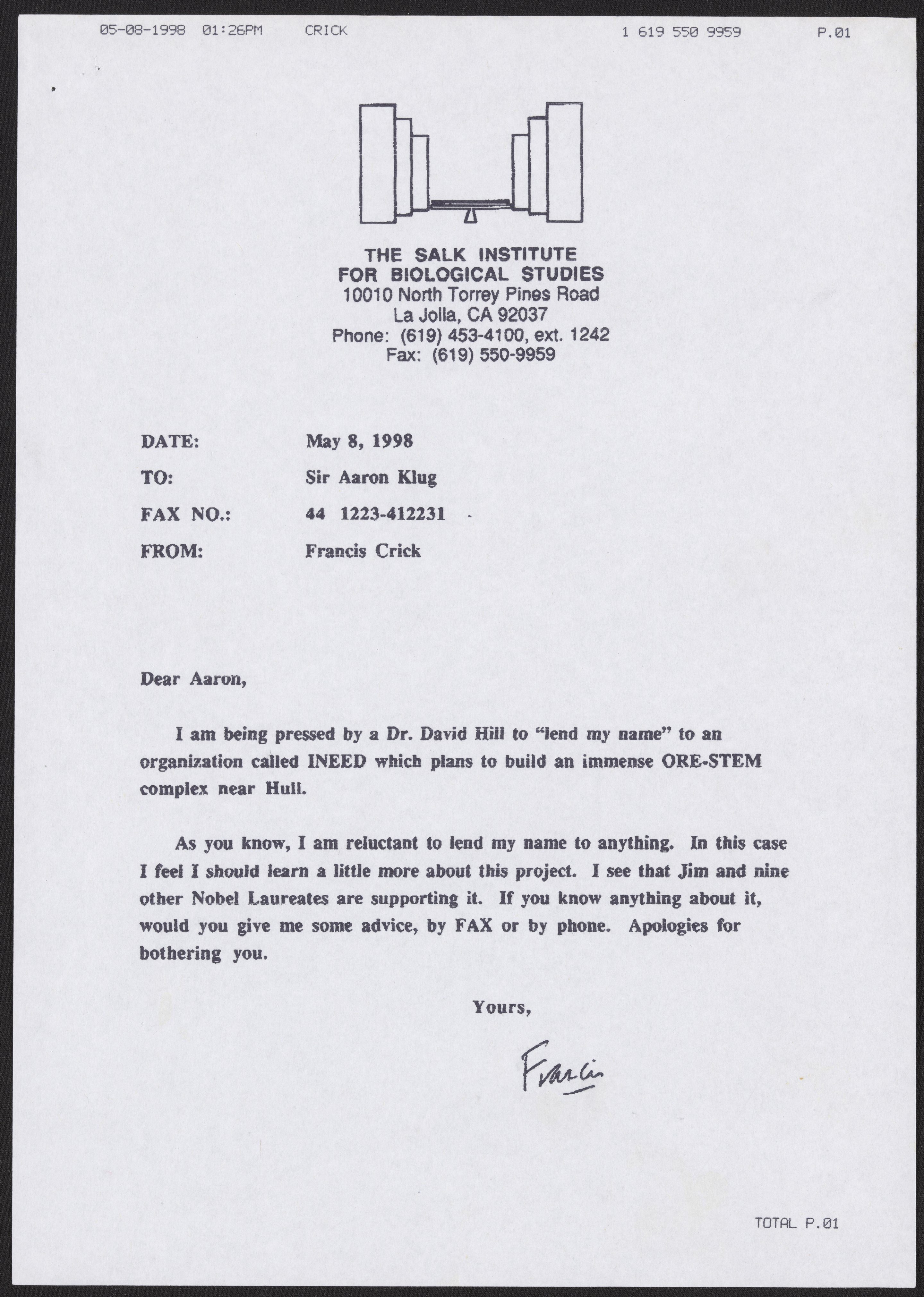 Letter from Francis Crick to Aaron Klug, May 8, 1998