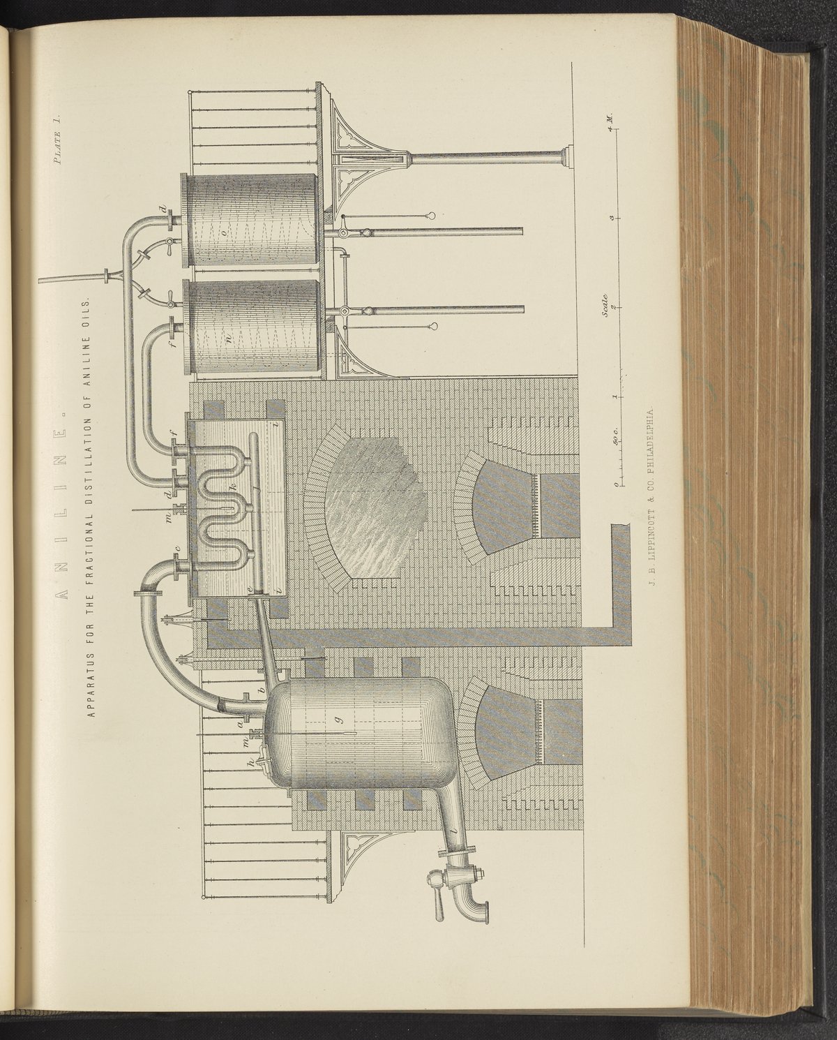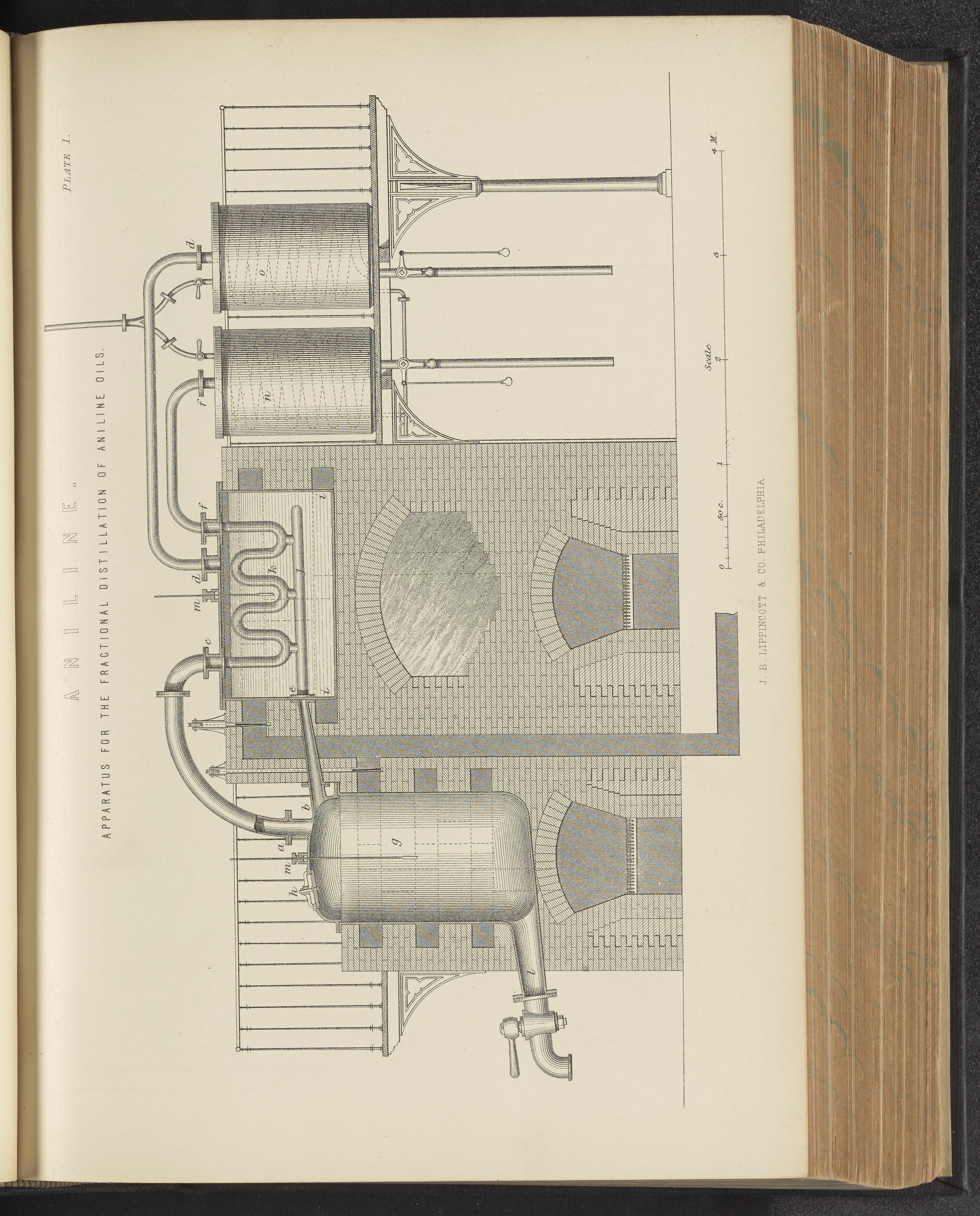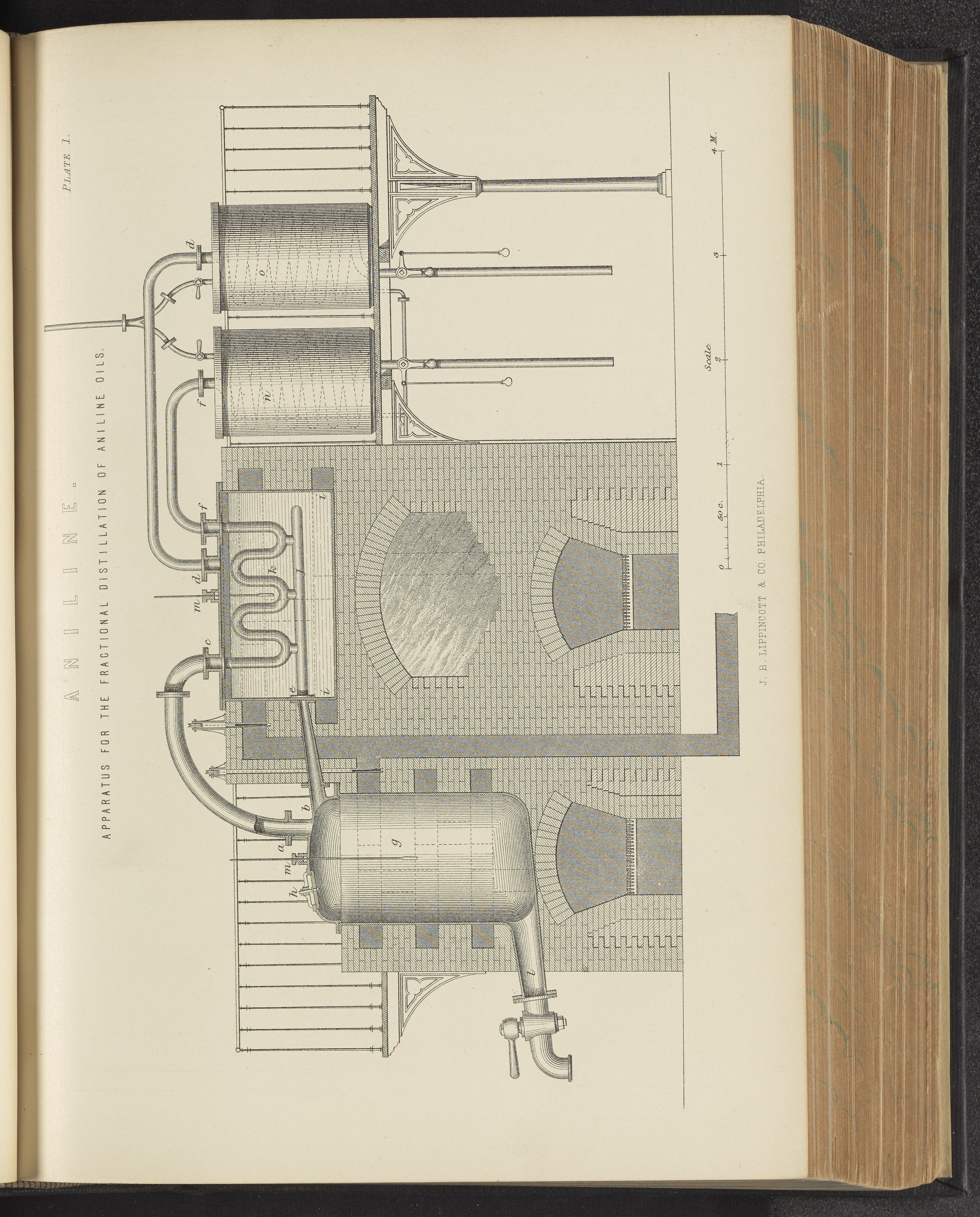 “Plate I: Aniline.” In Encyclopædia of Chemistry, Theoretical, Practical, and Analytical, as Applied to the Arts and Manufacturers, Vol. I and II. Philadelphia, Pennsylvania: J.B. Lippincott & Co., 1877. https://digital.sciencehistory.org/works/6108vb31r.