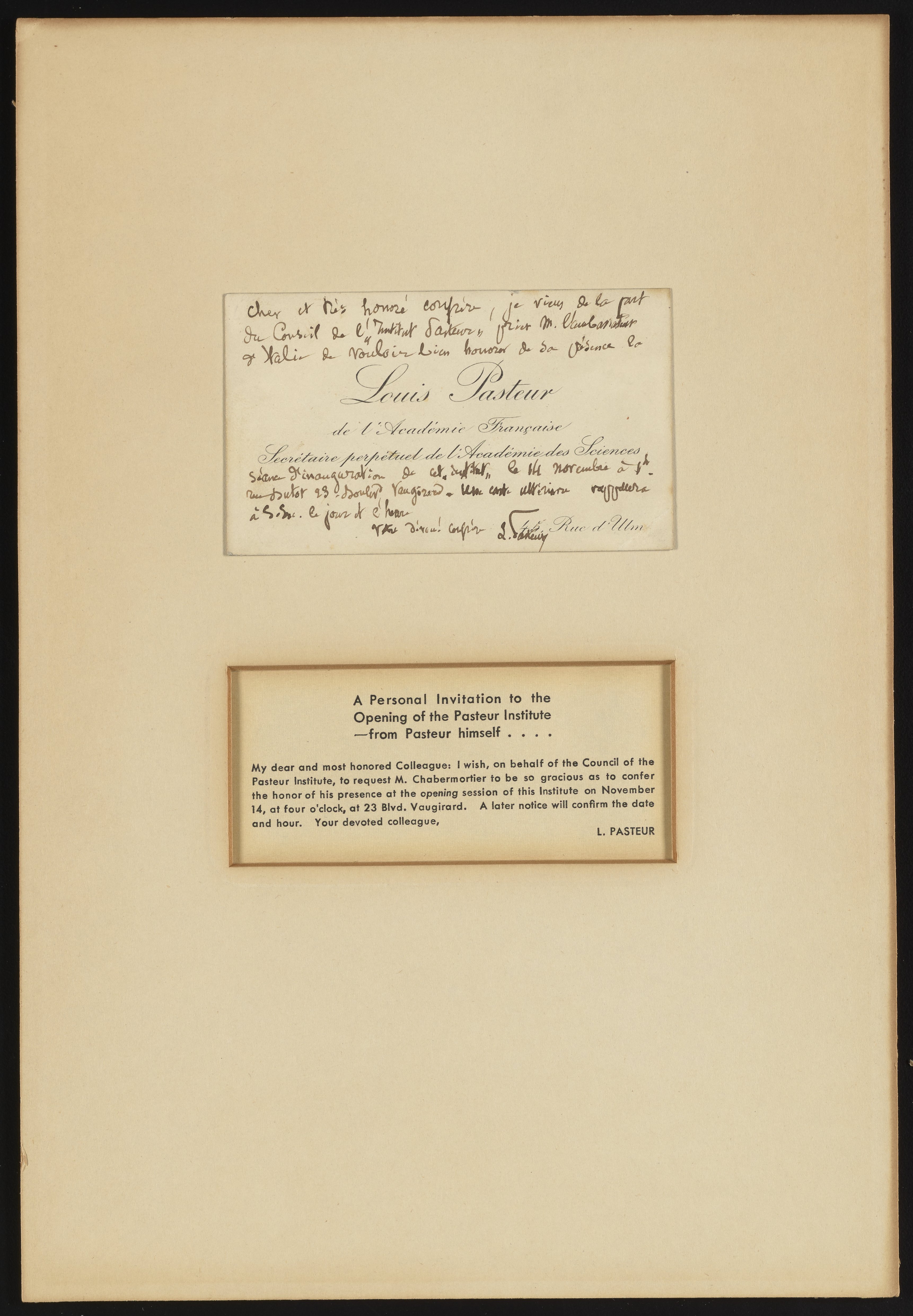 Pasteur, Louis. “Louis Pasteur's Personal Calling Card with Handwritten Invitation to M. Chabermortier to the Opening of the Pasteur Institute,” circa 1887. Fisher-Pasteur Memorial Collection, Box 1, Folder 5. Science History Institute. Philadelphia. https://digital.sciencehistory.org/works/6108vb34k.