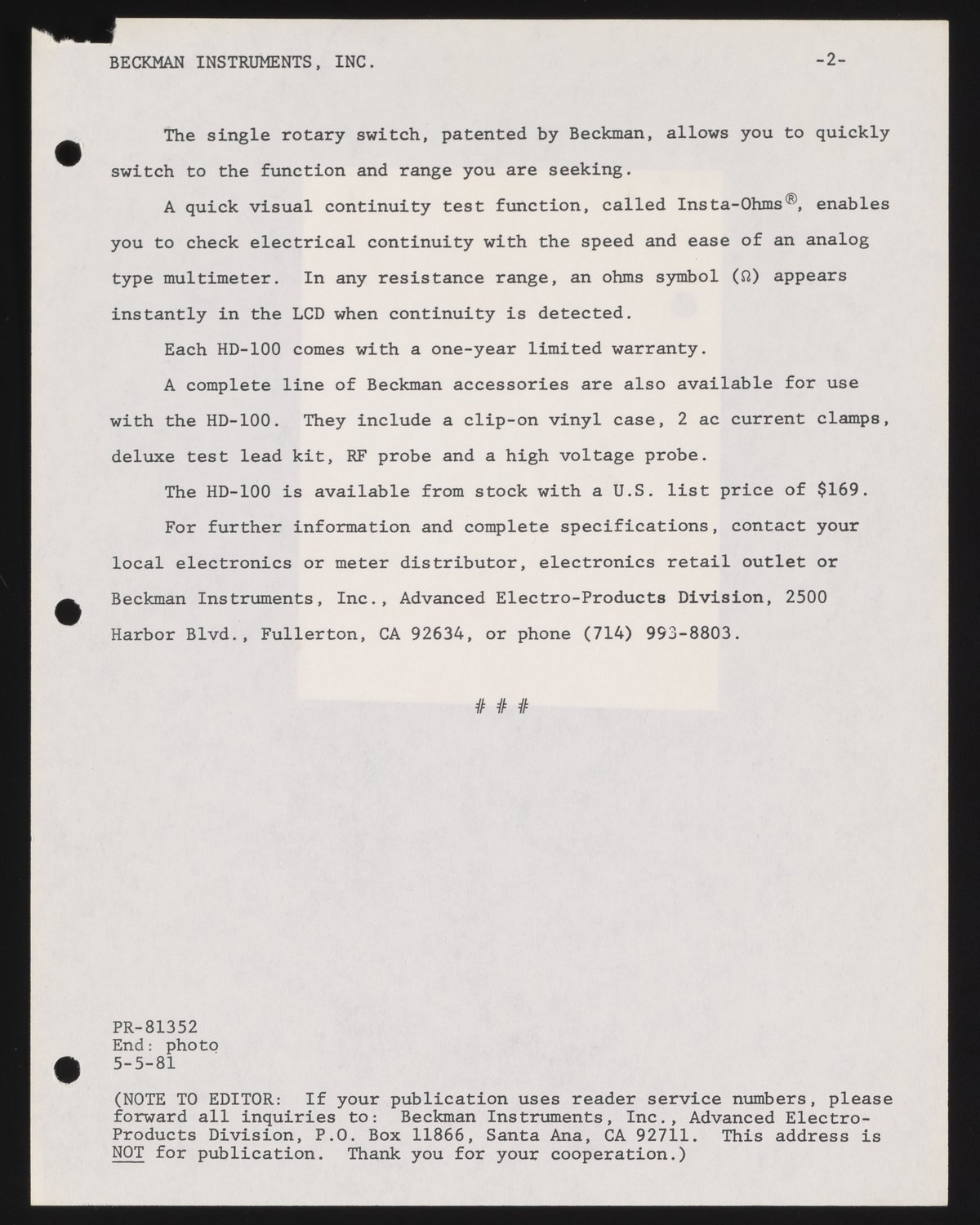 Fowler, Will. “Beckman Introduces a Heavy Duty DMM Portable That Can Really Take It,” May 5, 1981. Beckman Historical Collection, Box 58, Folder 69. Science History Institute. Philadelphia. https://digital.sciencehistory.org/works/6108vb74j.