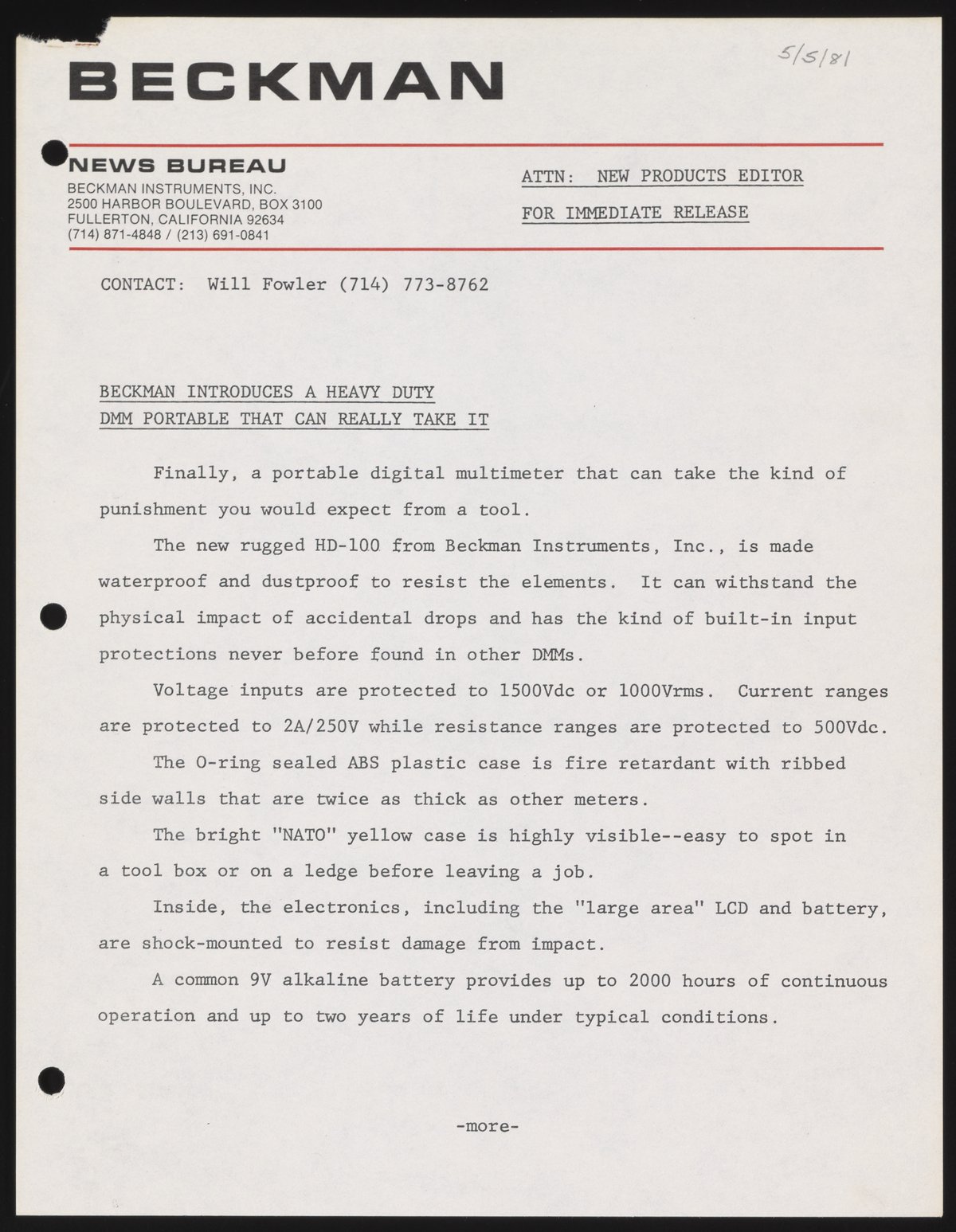 Fowler, Will. “Beckman Introduces a Heavy Duty DMM Portable That Can Really Take It,” May 5, 1981. Beckman Historical Collection, Box 58, Folder 69. Science History Institute. Philadelphia. https://digital.sciencehistory.org/works/6108vb74j.
