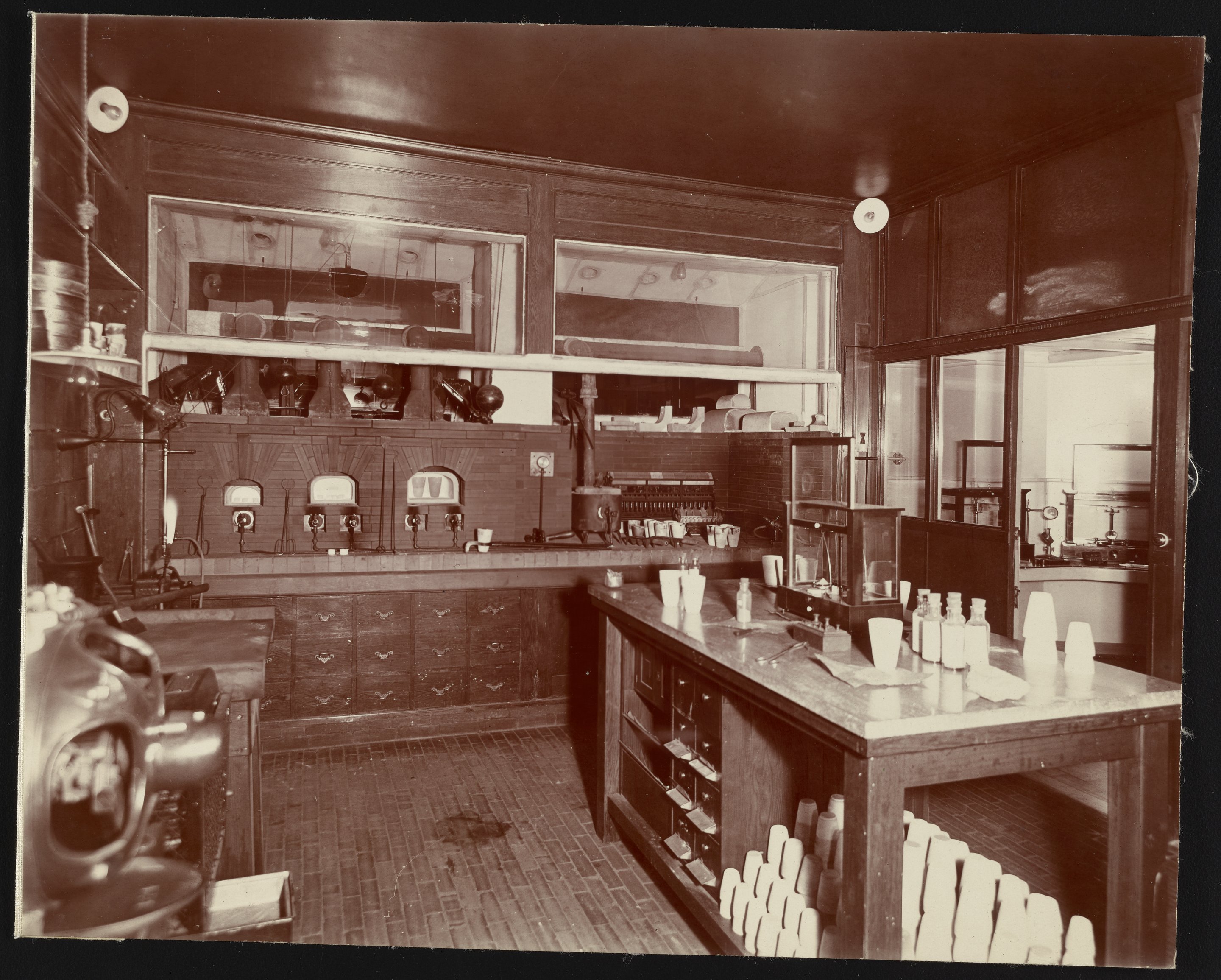 General view of a portion of the Dearborn Drug and Chemical Works (later Dearborn Chemical Company) 35th Street laboratory facilities located in Chicago, Illinois, with view of furnaces, assorted balances, and glassware. Founded in 1887, the Dearborn Chemical Company was a corporate ancestor of BetzDearborn, Incorporated best known for manufacturing water treatment chemicals for use in boilers, cooling towers, and steam locomotives.
