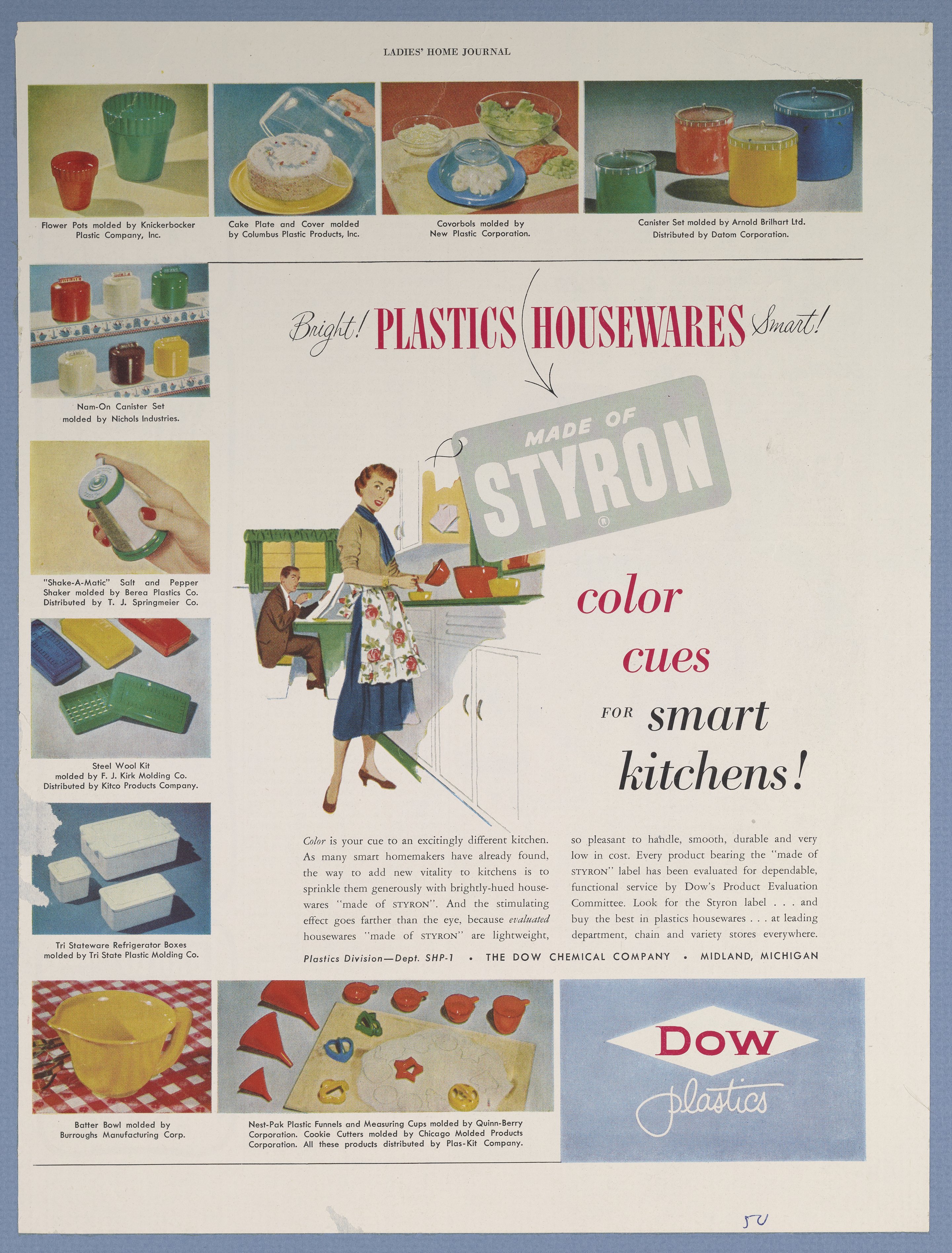 Dow Chemical Company. “Plastics Housewares Made of Styron: Color Cues for Smart Kitchens!,” 1950. Advertisements from the Dow Chemical Historical Collection, Box 5. Science History Institute. Philadelphia. https://digital.sciencehistory.org/works/61h0a3b.