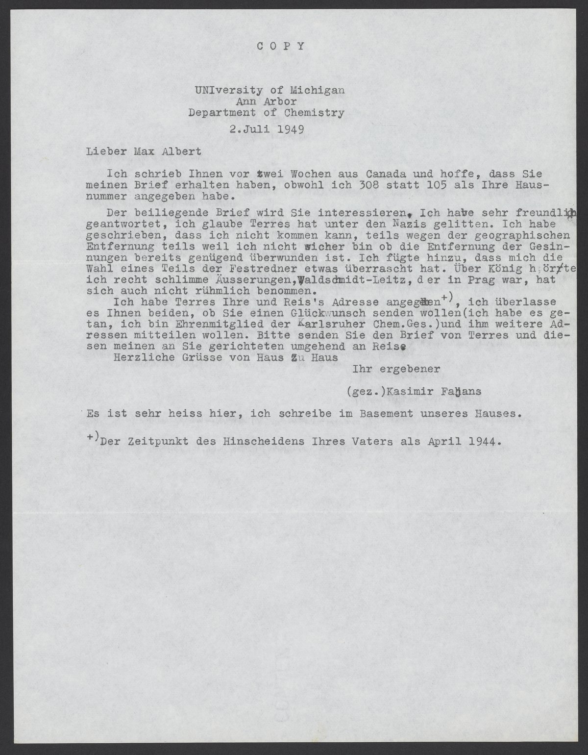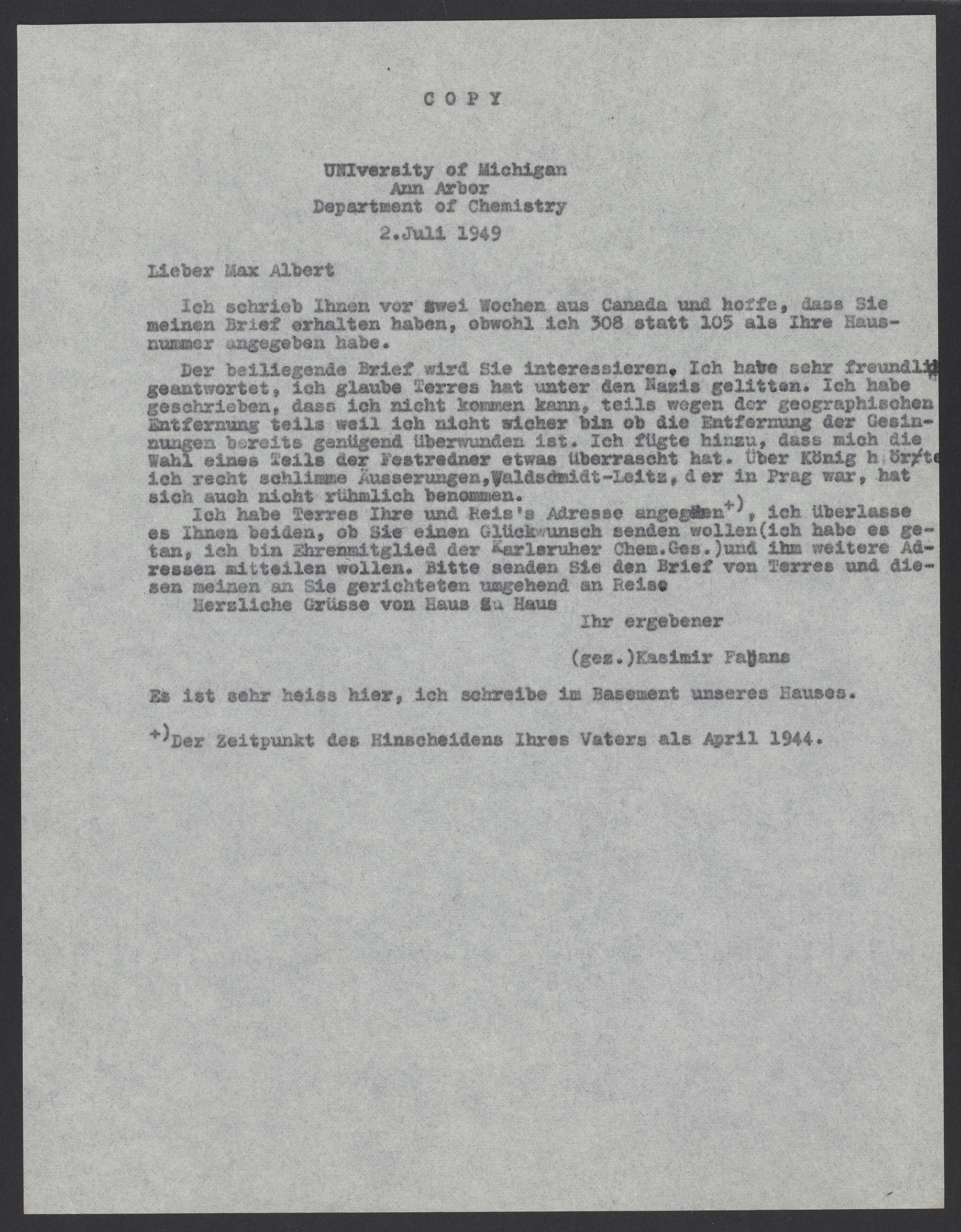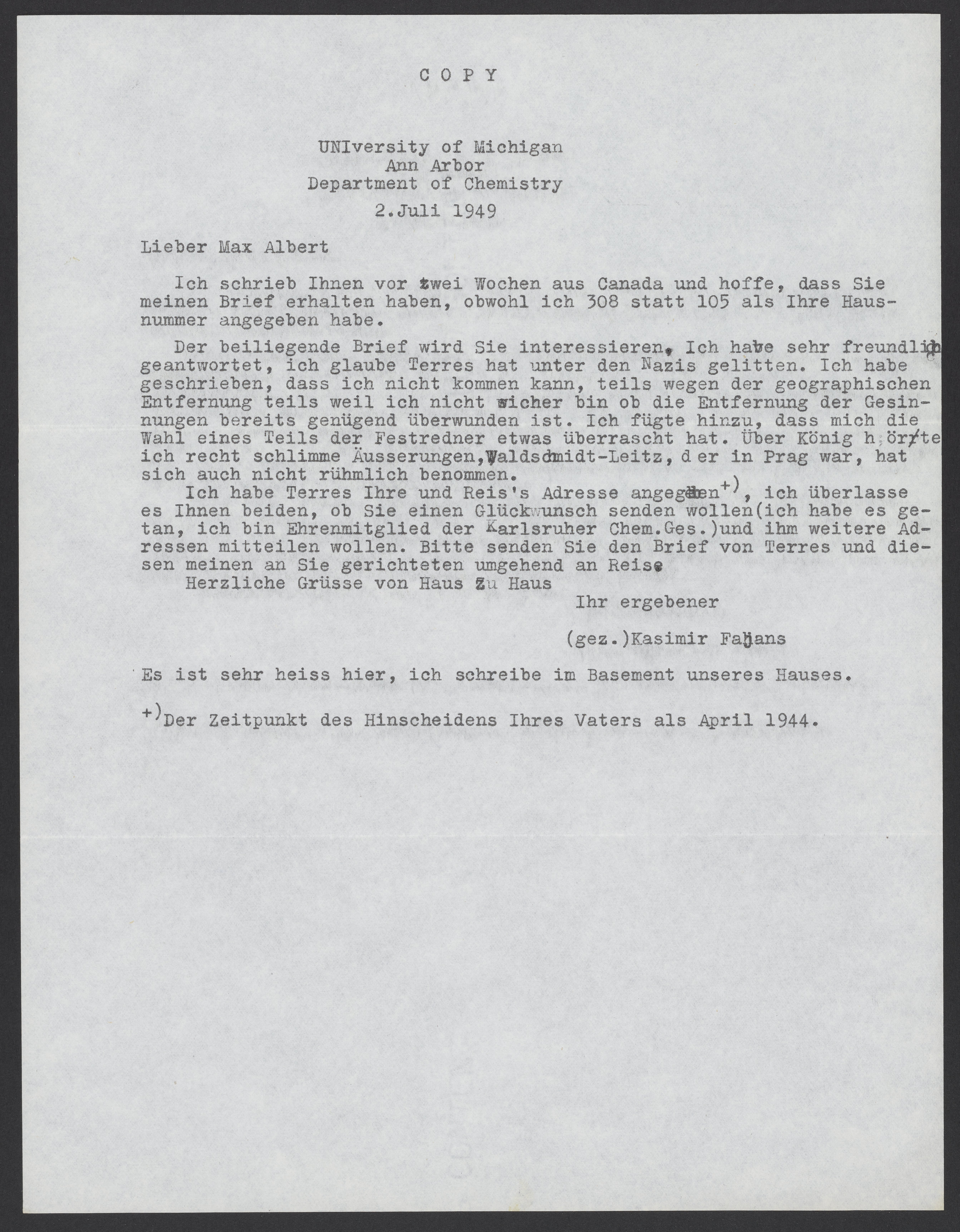 Letter from Kasimir Fajans to Max Bredig, July 2, 1949