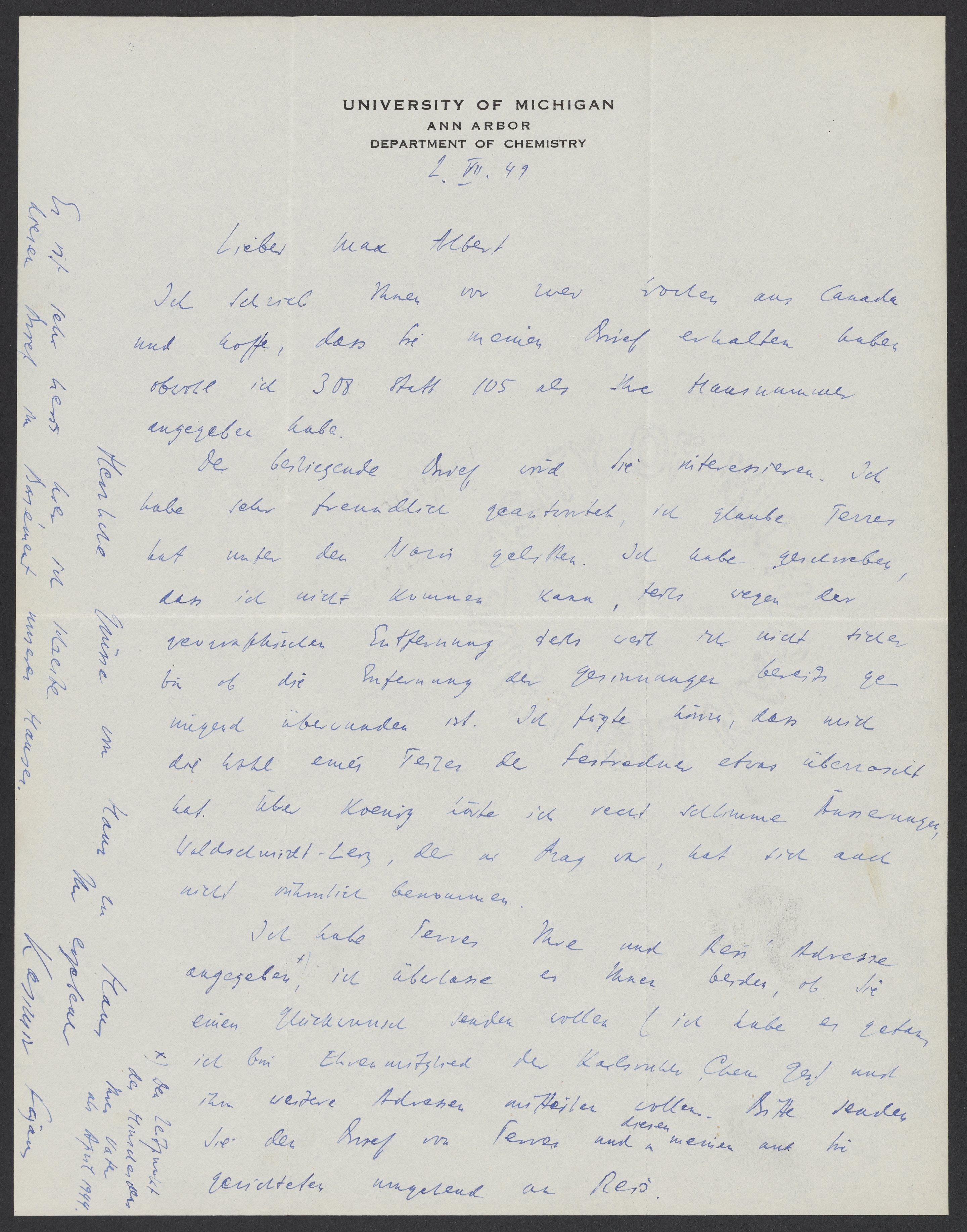 Small JPG1200 x 1529px — 246 KBLarge JPG2880 x 3668px — 1.5 MBFull-sized JPG5406 x 6885px — 5.2 MBOriginal fileTIFF — 5406 x 6885px — 107 MBA letter from Kasimir Fajans (1887-1975) to Max Albert Bredig (1902-1977) about correspondence from Ernst Terres (1887-1958) in Germany, who was inquiring about German scientists in the United States.