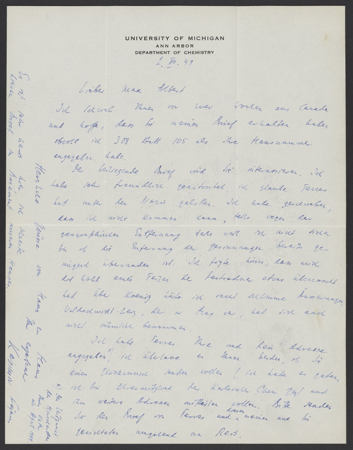Ich habe Terres Ihre und Reis’s Adresse angegeben +), ich überlasse es Ihnen beiden, ob Sie einen Glückwunsch senden wollen (ich habe es getan, ich bin Ehrenmitglied der Karlsruher Chem. Ges.) und ihm weitere Adressen mitteilen wollen. Bitte senden Sie den Brief von Terres und diesen meinen an Sie gerichteten umgehen an Reis.