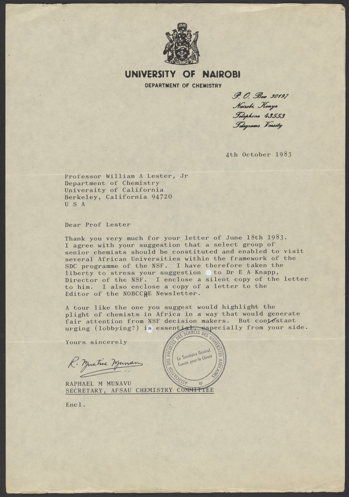 Letter to William A. Lester, Jr. from Raphael M. Munavu, October 4, 1983