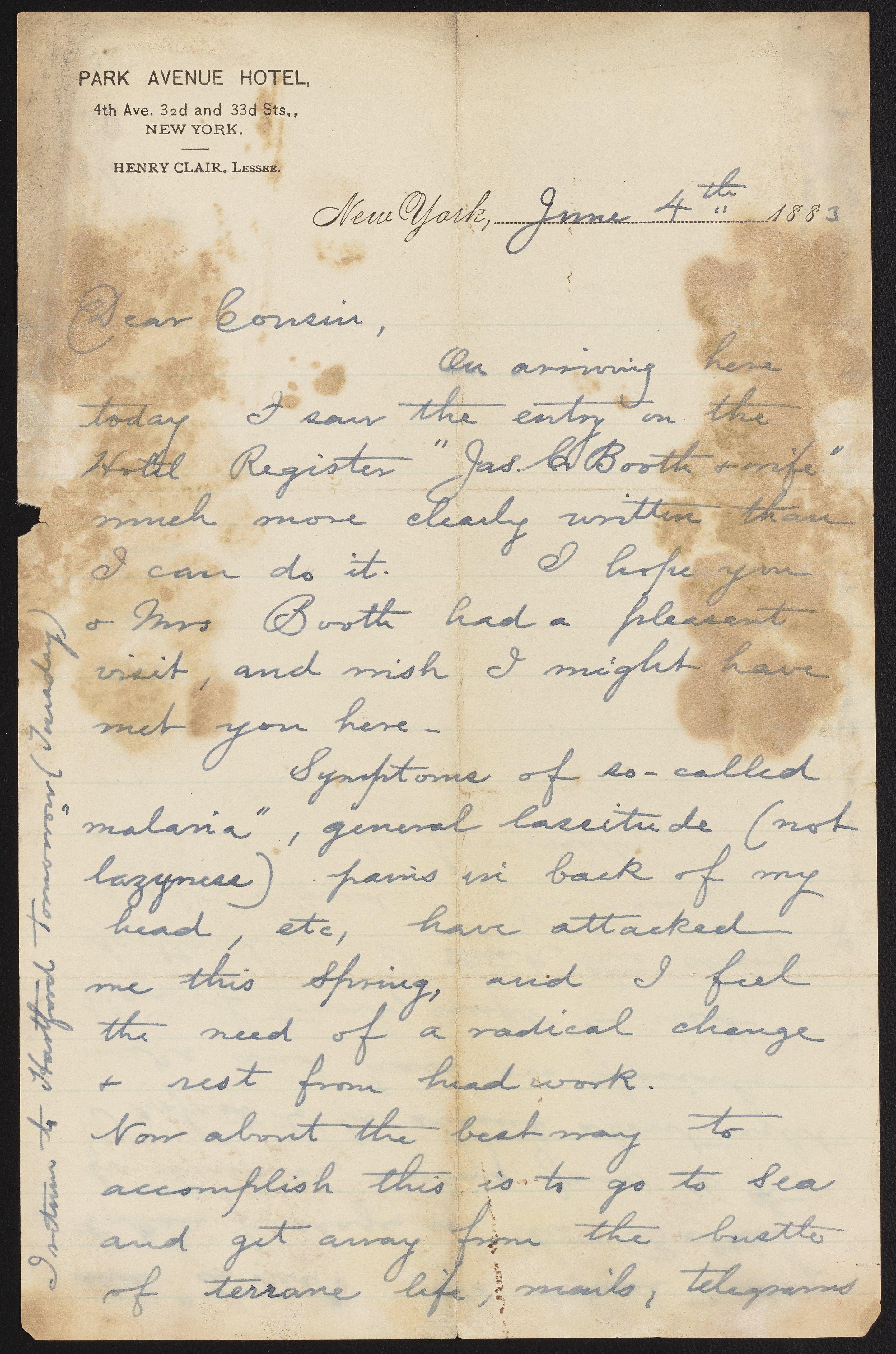 Small JPG1200 x 1813px — 350 KBLarge JPG2880 x 4352px — 1.9 MBFull-sized JPG3670 x 5546px — 2.9 MBOriginal fileTIFF — 3670 x 5546px — 58.3 MBHenry Carrington Bolton (1843-1903), an American chemist, professor of science at Trinity College, and relative of James Curtis Booth (1810-1888), writes to Booth, mentioning his fatigue from proofreading his Catalogue of Scientific and Technical Periodicals and his plans to sail for Liverpool on the S.S. Baltic with a view to seeing Scotland.